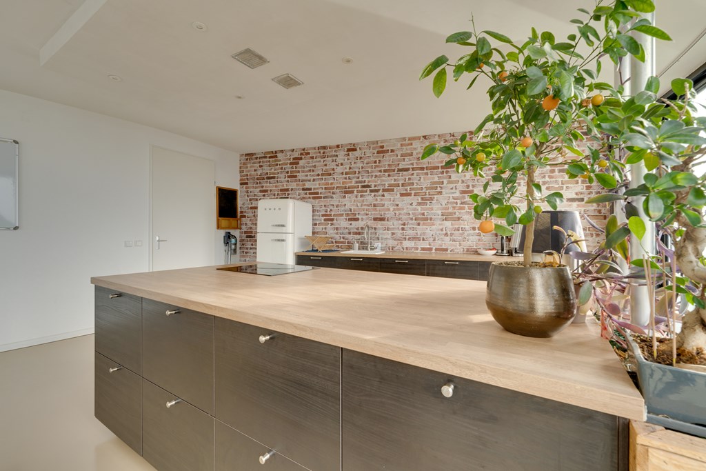 De open keuken bevindt zich aan de linkerzijde van de woning en is uitgevoerd met een wandopstelling en een kookeiland. De keuken is voorzien van diverse inbouwapparatuur, waaronder een vaatwasser, inductiekookplaat, combi-oven en een luxe mengkraan. Het geheel is afgewerkt met een houten werkblad en biedt volop werk- en bergruimte.
