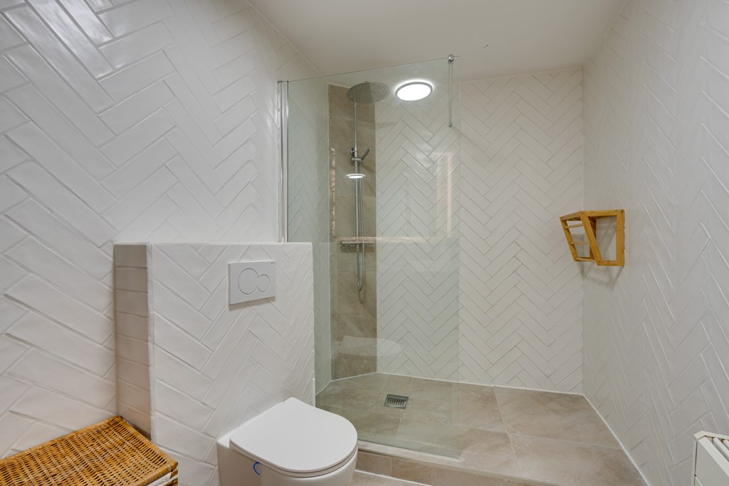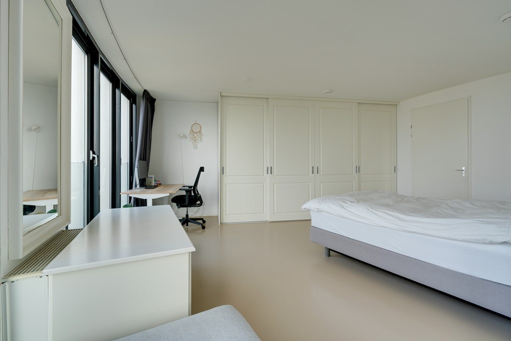 Aan de rechterzijde van het appartement bevindt zich, achter de wand, de slaapkamer. Deze is via twee zijden toegankelijk en beschikt over een vaste kastenwand van circa vier meter lang. Vanuit de slaapkamer heb je directe toegang tot de stijlvolle badkamer (2021), voorzien van een inloopdouche met regen- en handdouche, een wastafel met houten meubel en een tweede toilet.