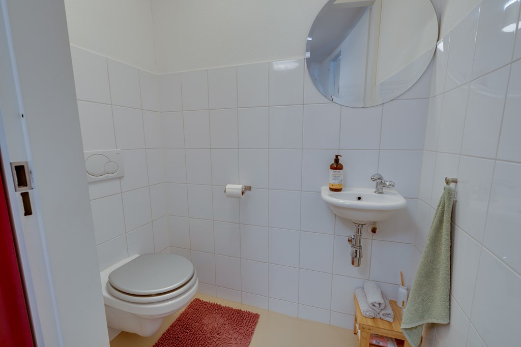 On the right side of the apartment, behind the partition wall, you will find the bedroom. Accessible from two sides, it features a built-in wardrobe approximately four meters in length. From the bedroom you have direct access to the stylish bathroom (2021), fitted with a walk-in shower with rain and hand shower, a washbasin with wooden vanity unit, and a second toilet.