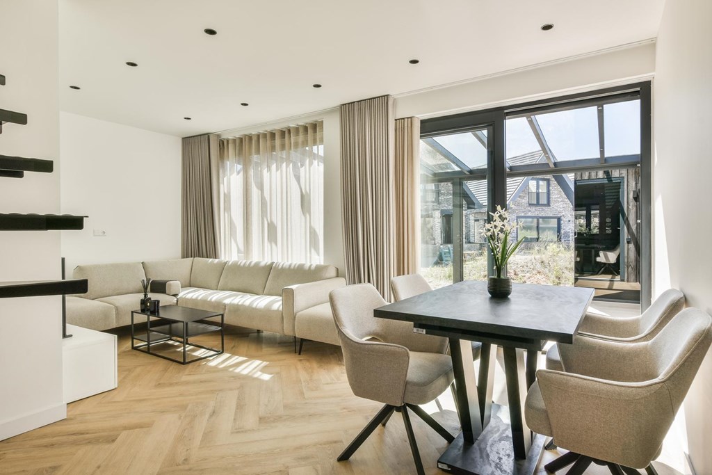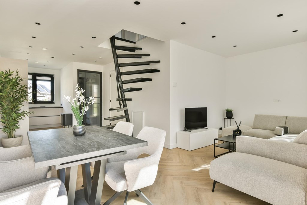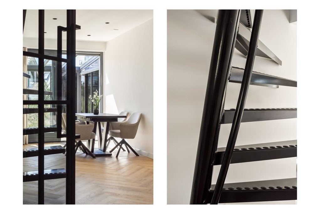 De woonkamer is heerlijk licht dankzij de grote schuifpui naar de serre. Er is volop ruimte voor een comfortabele zithoek en een gezellige eettafel. De moderne trap van zwart staal vormt een mooi designaccent in de ruimte.