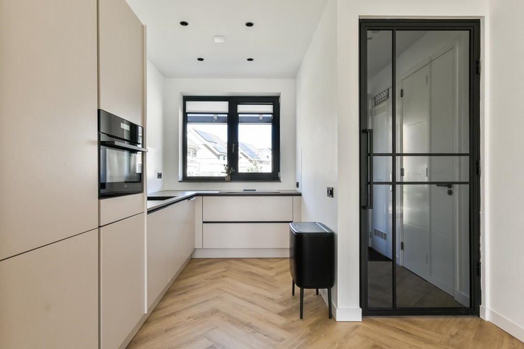 The conservatory is truly the showpiece of this home — a delightful extra living area that can be enjoyed all year round. Open the glass doors to seamlessly connect indoors and outdoors, with a view of the green park behind the house. Or stay cozy and warm inside with the terrace heater on — it’s the perfect spot for every season. At the front of the house is the luxurious L-shaped kitchen. The light sand-colored cabinets and composite countertop create a calm, elegant aesthetic. Naturally, the kitchen is equipped with high-quality built-in appliances, including an induction cooktop with downdraft extractor, refrigerator, freezer, dishwasher, and combination oven/microwave.