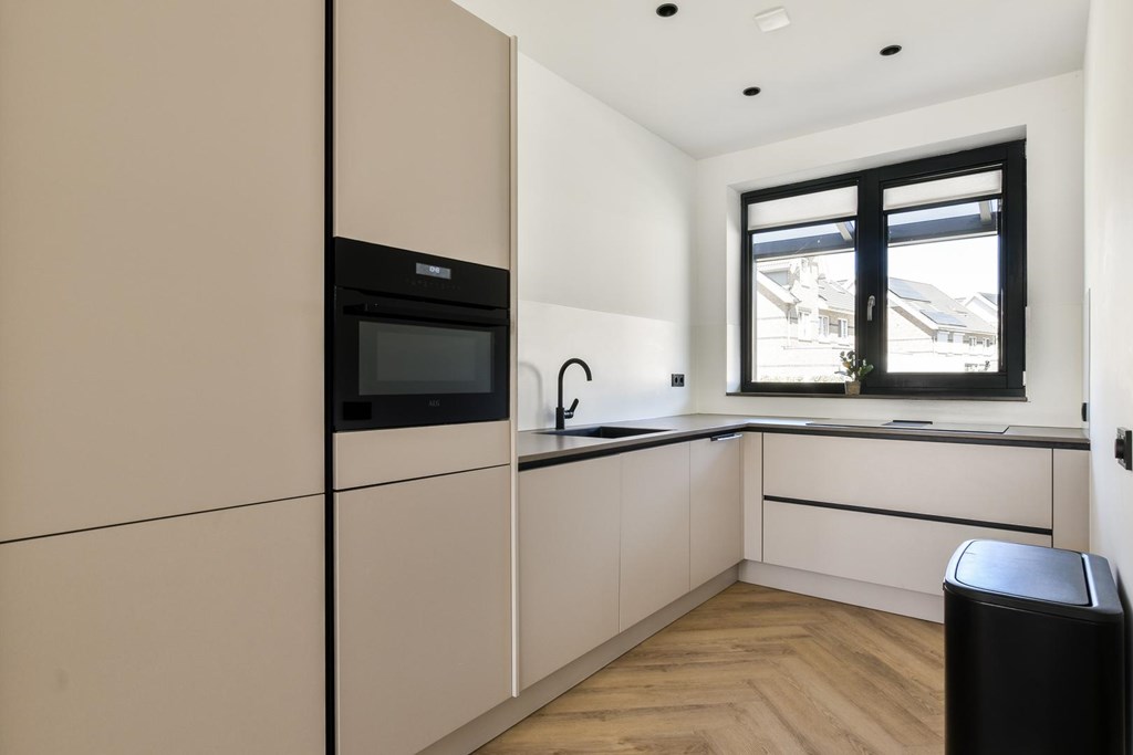 Aan de voorzijde ligt de luxe keuken in L-opstelling. De lichte zandkleurige kastfronten en het composieten werkblad creëren een rustige, stijlvolle uitstraling. Uiteraard is de keuken voorzien van hoogwaardige inbouwapparatuur, waaronder een inductiekookplaat met downdraft, koelkast, vriezer, vaatwasser en combimagnetron/oven.