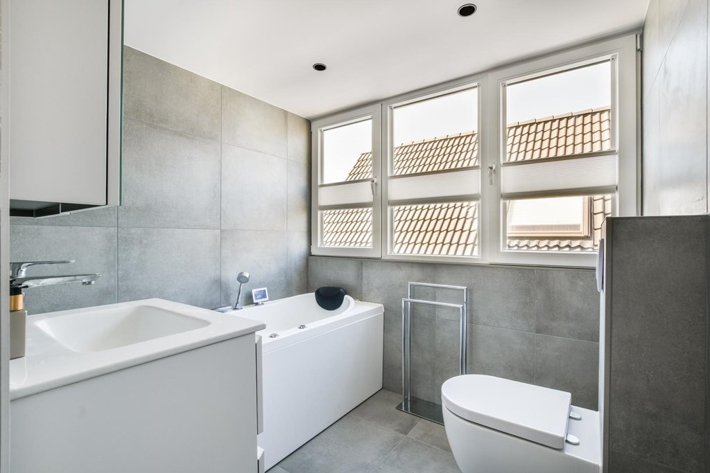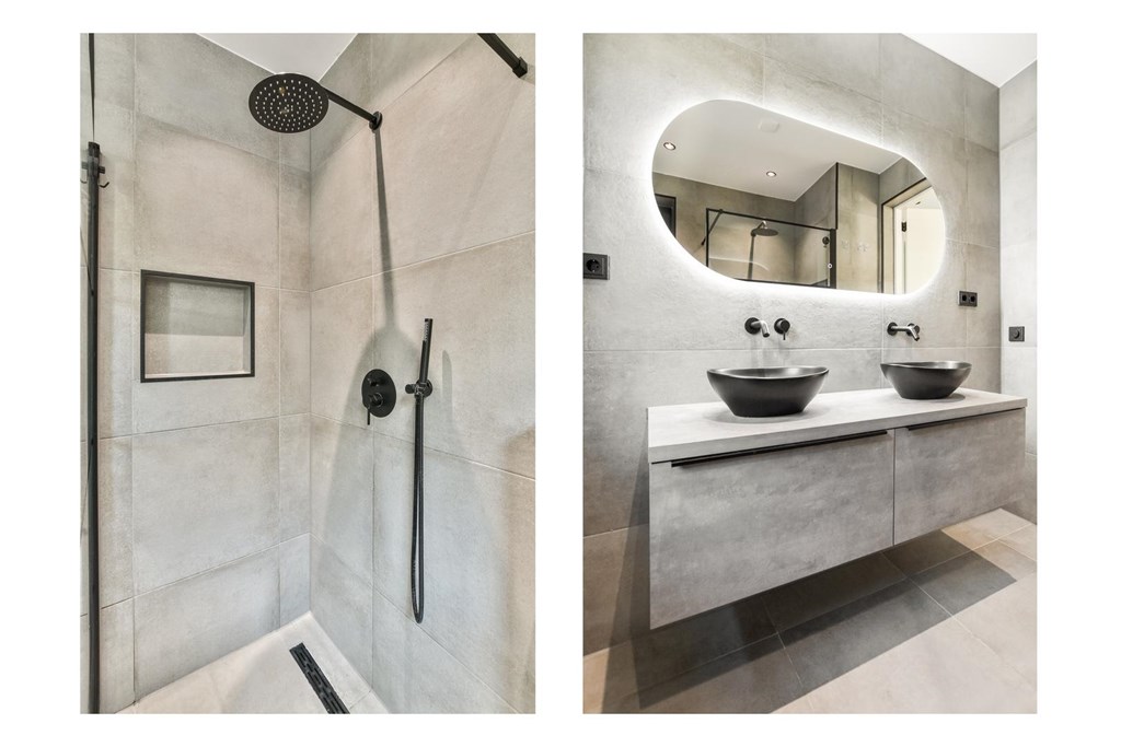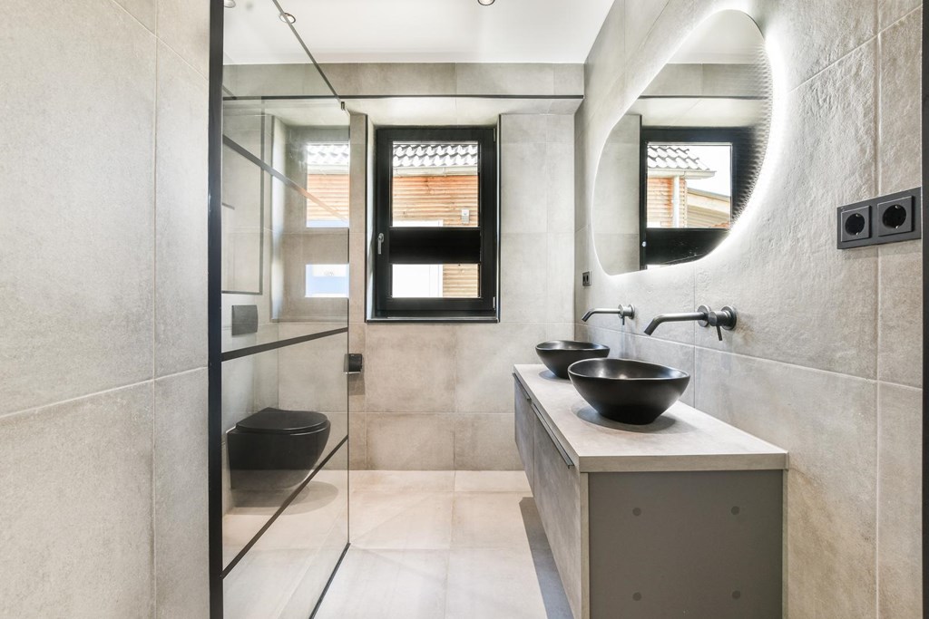 De slaapkamer op de begane grond maakt de woning levensloopbestendig en comfortabel. De aangrenzende badkamer is modern afgewerkt met grote lichtgrijze tegels, een inloopdouche, dubbele wastafel en vrijhangend toilet.