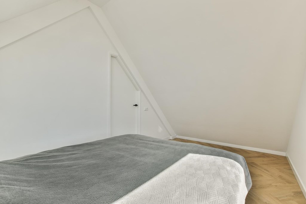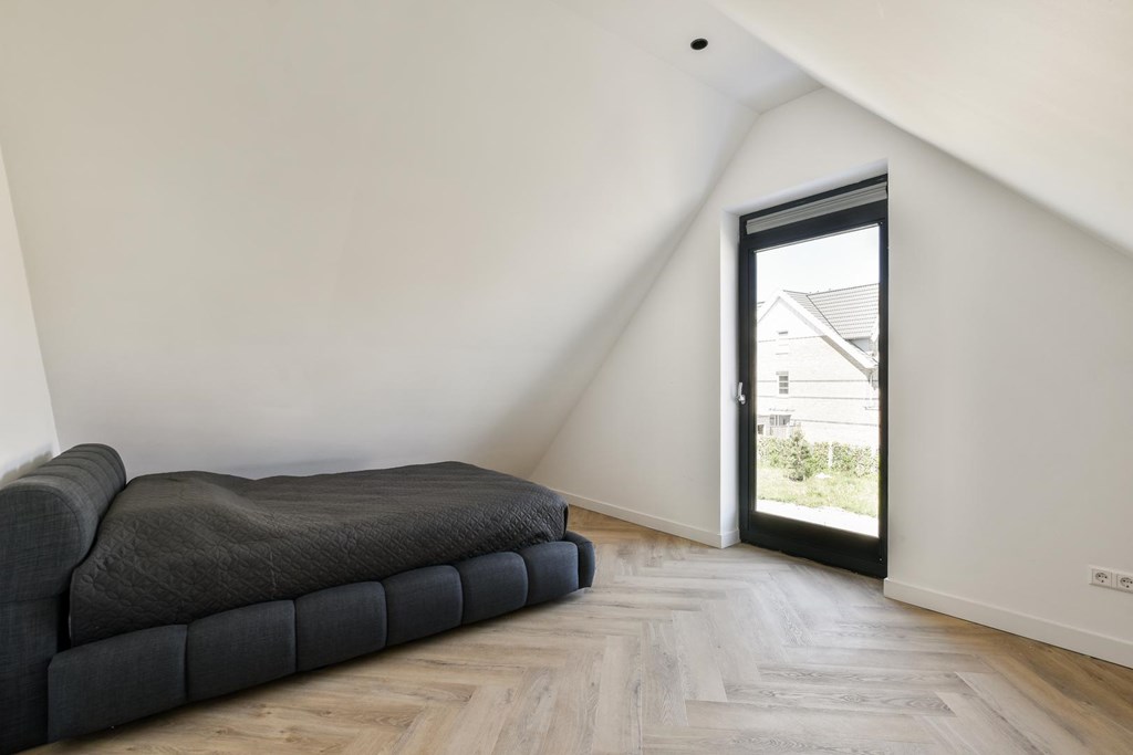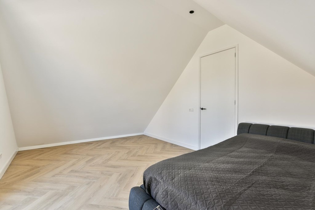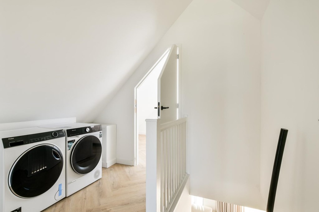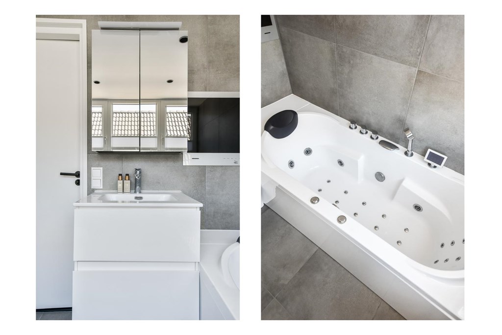 Op de eerste verdieping bevinden zich nog twee ruime slaapkamers, beide met hoge nok en veel lichtinval. Hier vind je ook de tweede badkamer — een heerlijke plek om te ontspannen met een whirlpoolbad en ingebouwde televisie. Daarnaast is er een toilet, wastafelmeubel en een kunststof dakkapel die extra ruimte en licht geeft. Op de overloop is plek voor de wasmachine en droger.