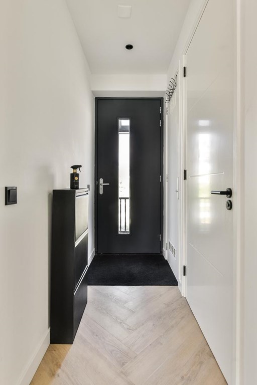 Via de veranda stap je binnen in een lichte en strak afgewerkte woning. De prachtige PVC visgraatvloer met vloerverwarming en de glad gestuukte witte wanden zorgen meteen voor een moderne, rustige sfeer. Vanuit de hal heb je toegang tot de slaapkamer en badkamer op de begane grond, én tot de sfeervolle woonkamer met open keuken. De zwarte aluminium deur en ingebouwde spotverlichting geven de woning een luxe, eigentijdse uitstraling.