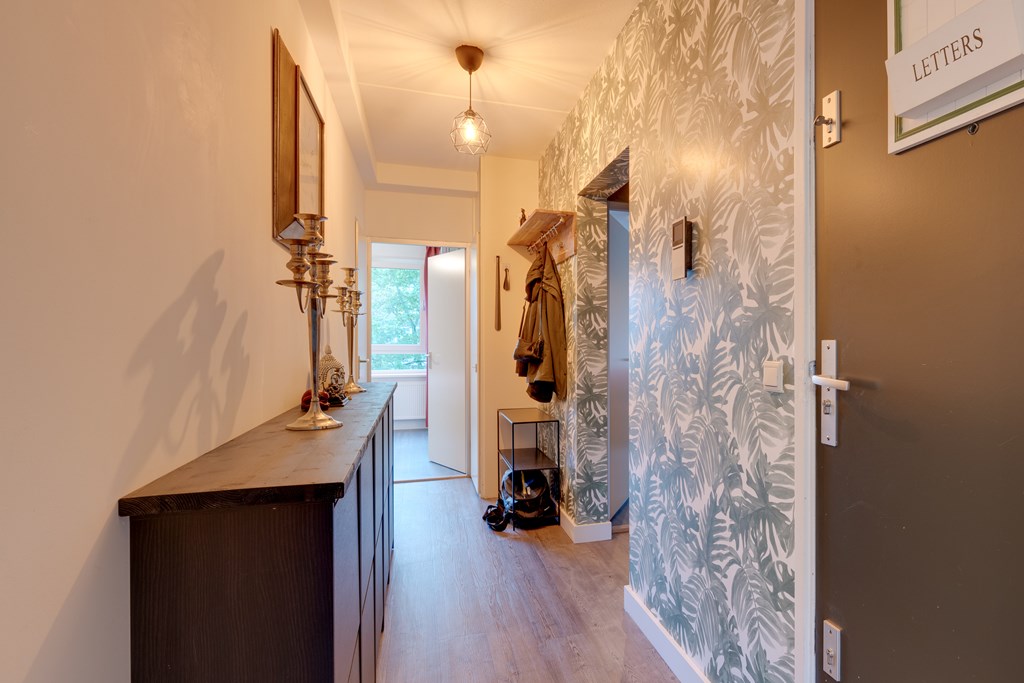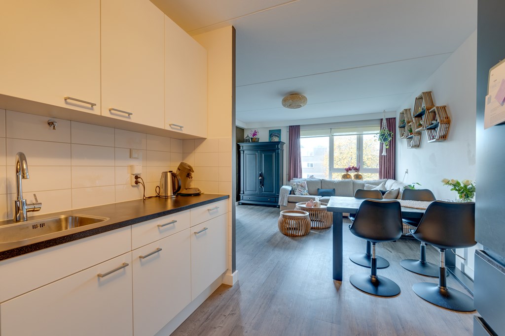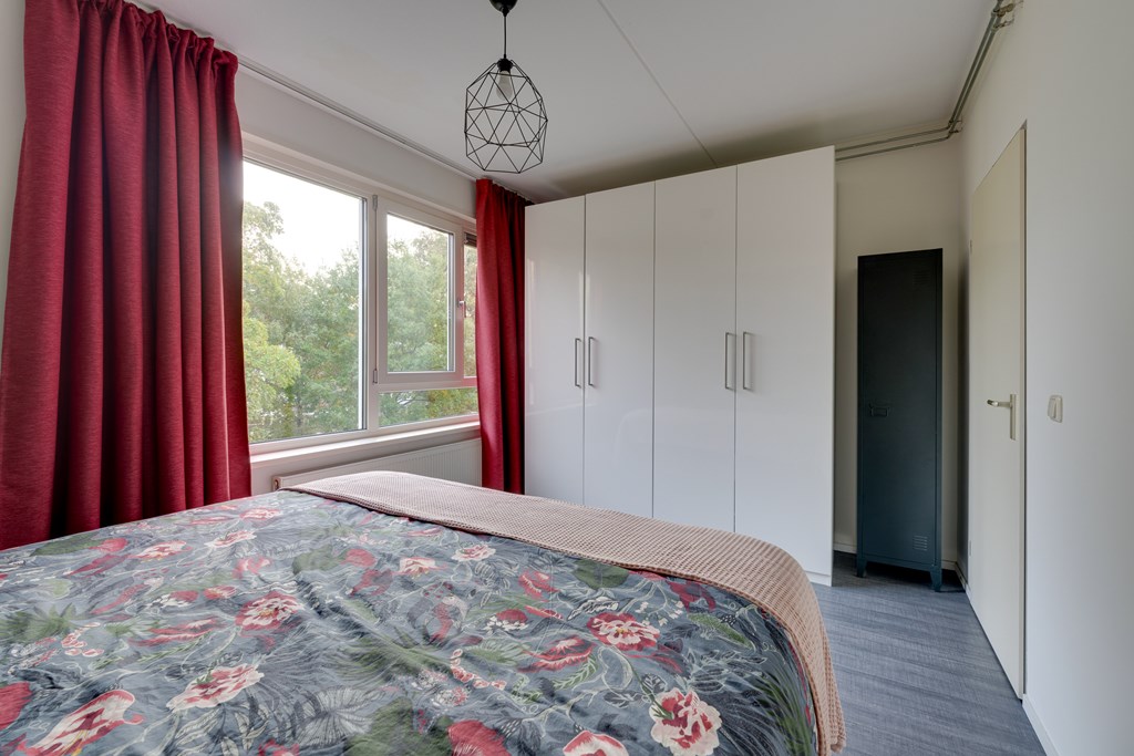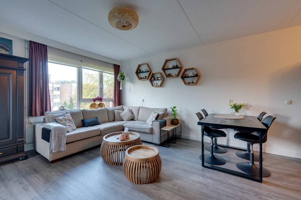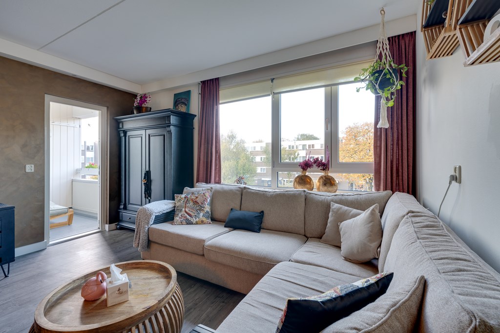 Via het verzorgde gemeenschappelijke trappenhuis bereik je de woning op de tweede verdieping. Vanuit de hal heb je toegang tot vrijwel alle vertrekken, te beginnen met de lichte woonkamer. Deze bevindt zich aan de voorzijde van het appartement. Grote raampartijen zorgen voor een overvloed aan daglicht en een prachtig uitzicht over het omliggende groen. Een heerlijke ruimte om te ontspannen of gasten te ontvangen. Vanuit de woonkamer stap je het balkon op het zuidwesten op – een fijne plek om te genieten van de middag- en avondzon.