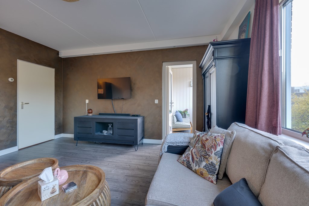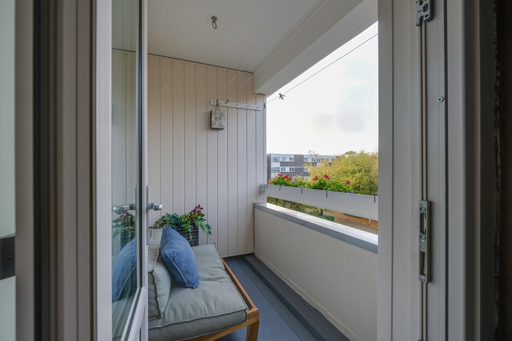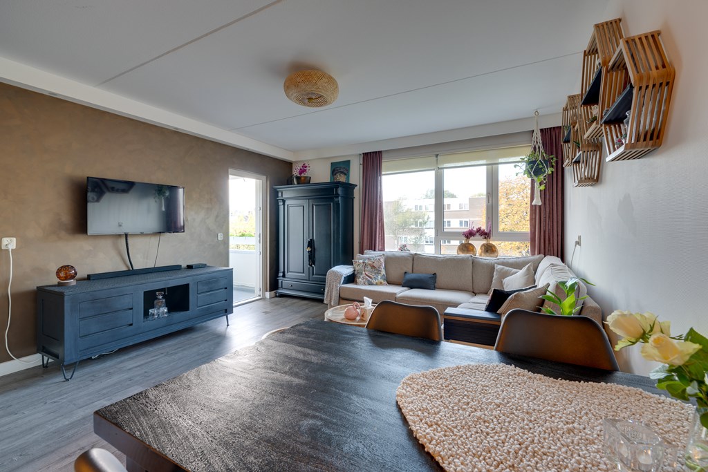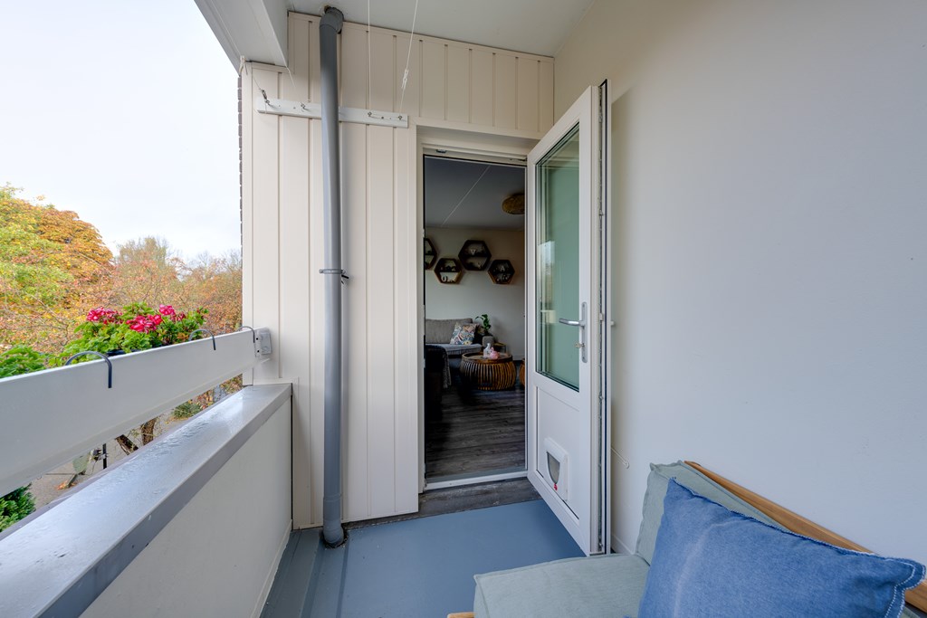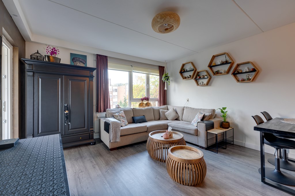 Via het verzorgde gemeenschappelijke trappenhuis bereik je de woning op de tweede verdieping. Vanuit de hal heb je toegang tot vrijwel alle vertrekken, te beginnen met de lichte woonkamer. Deze bevindt zich aan de voorzijde van het appartement. Grote raampartijen zorgen voor een overvloed aan daglicht en een prachtig uitzicht over het omliggende groen. Een heerlijke ruimte om te ontspannen of gasten te ontvangen. Vanuit de woonkamer stap je het balkon op het zuidwesten op – een fijne plek om te genieten van de middag- en avondzon.