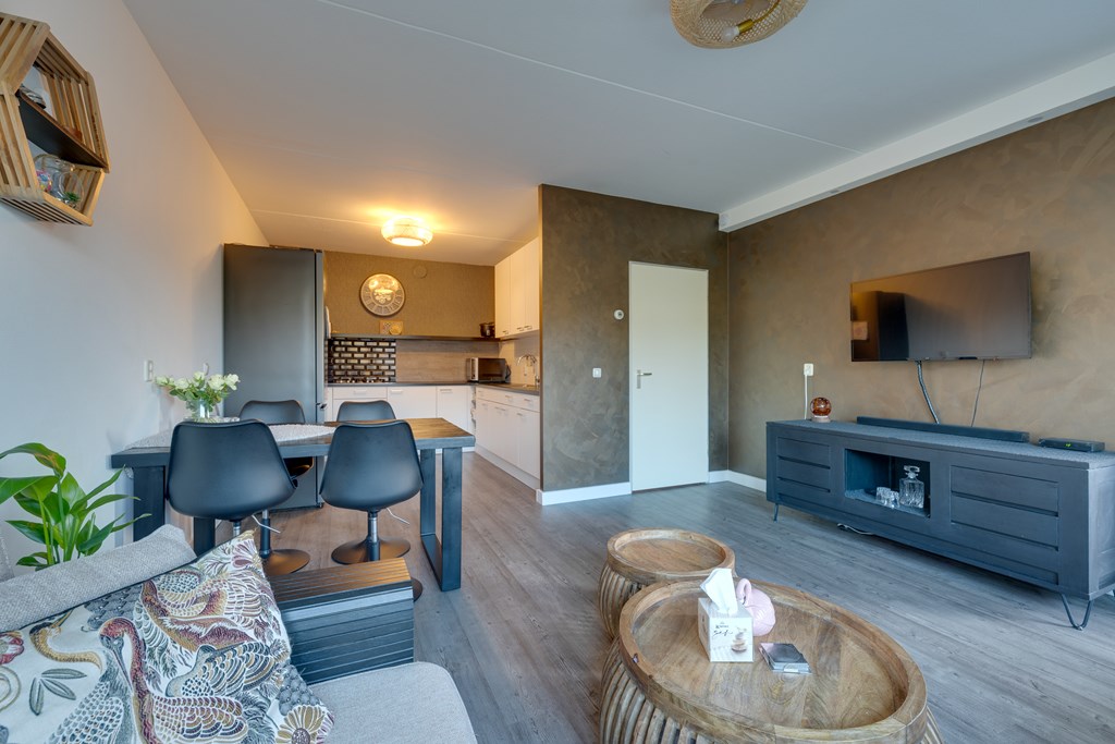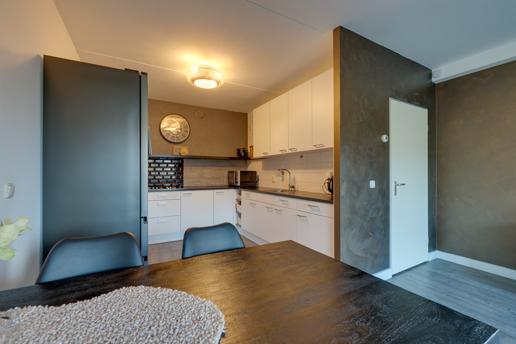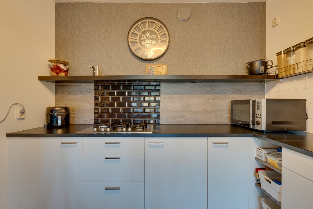 Aansluitend bevindt zich de moderne open keuken in hoekopstelling. Deze is voorzien van diverse inbouwapparatuur, waaronder een 5-pits gaskookplaat, koelkast, vriezer, combimagnetron en een luxe mengkraan. De hoogwaardige afwerking, warme kleurstelling en het ruime werkblad zorgen voor een luxe uitstraling.