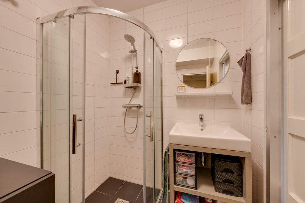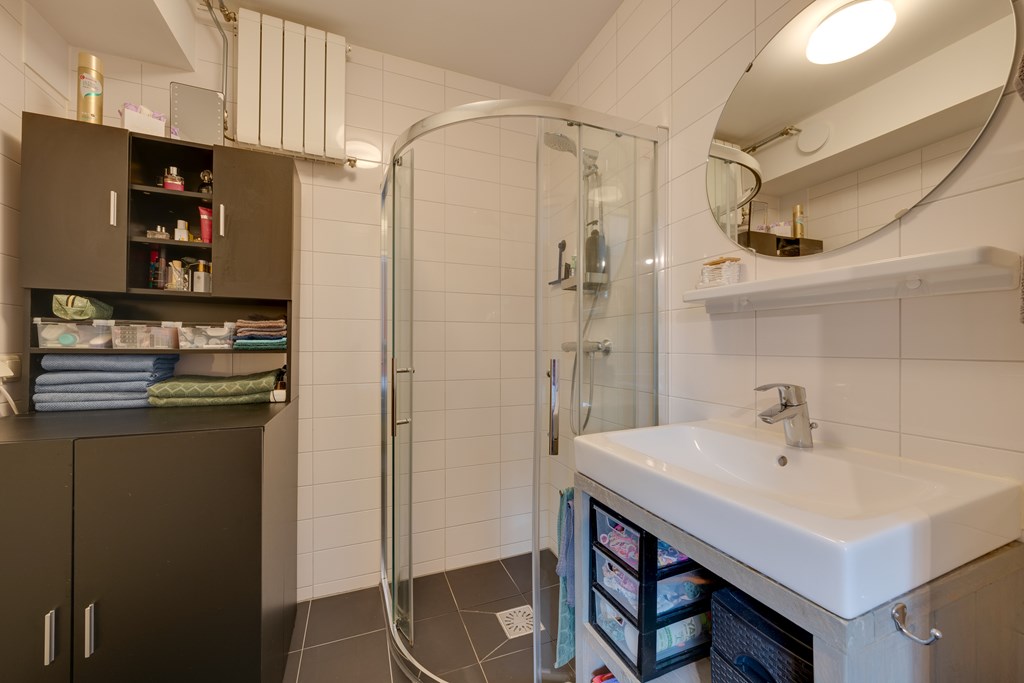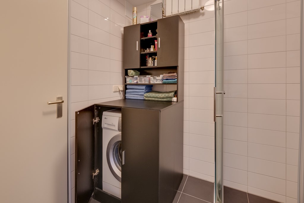 De moderne badkamer is centraal in de woning gesitueerd en uitgerust met een douchecabine, wastafelmeubel en aansluitingen voor wasmachine en droger. Het separate toilet bevindt zich naast de badkamer.