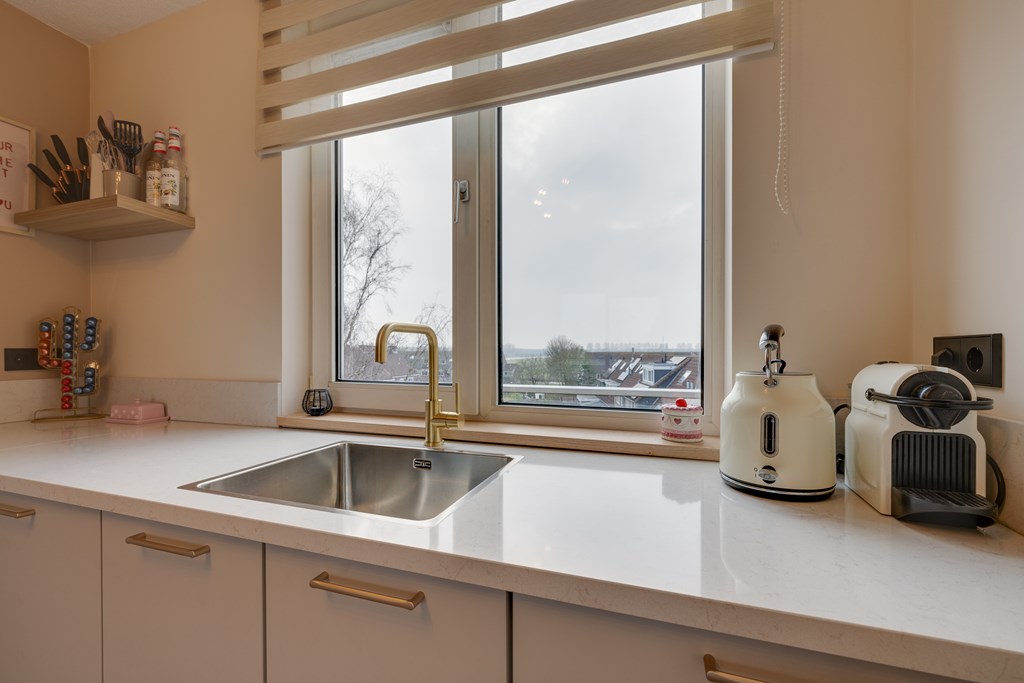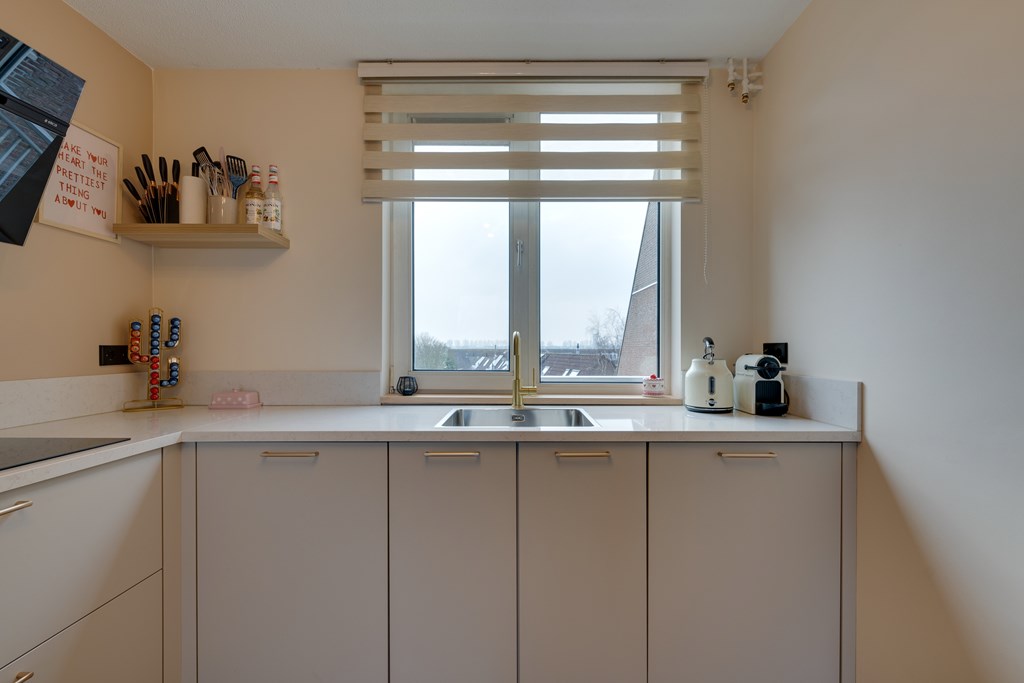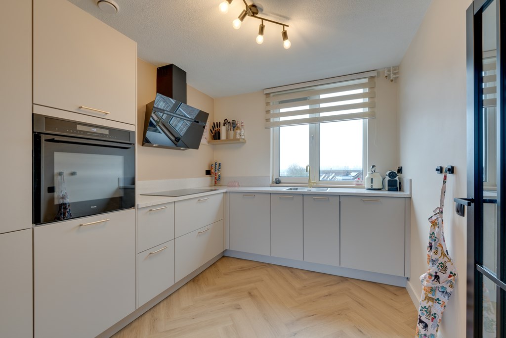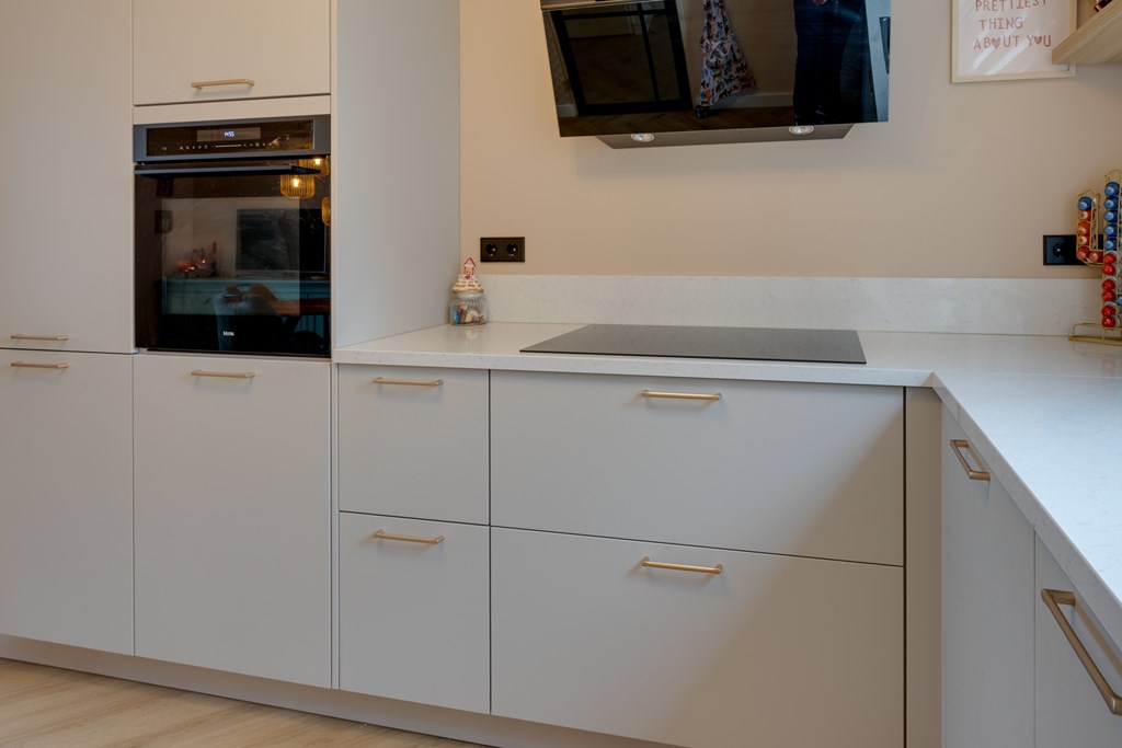 De stijlvolle open keuken uit 2024 bevindt zich aan de voorzijde van de woning en is uitgevoerd in een praktische hoekopstelling. Je beschikt over diverse inbouwapparatuur, waaronder een vaatwasser, een combi oven, inductiekookplaat, een afzuiginstallatie, koel- vriescombinatie en een luxe mengkraan. Het strakke composieten werkblad en de ruime kastopstelling maken het geheel compleet.