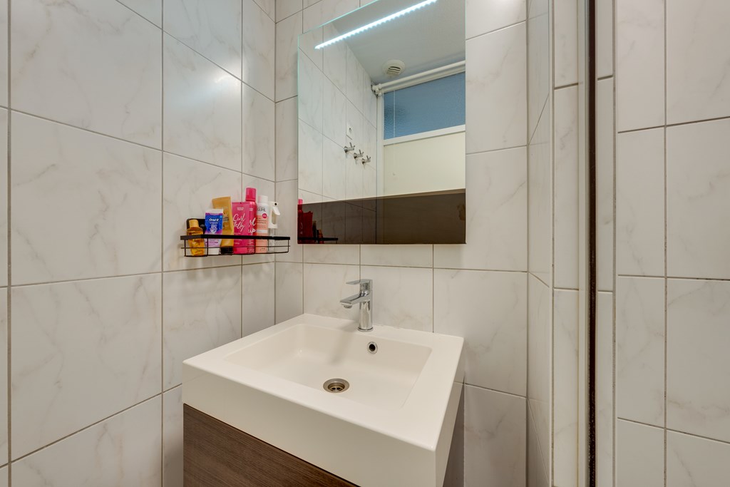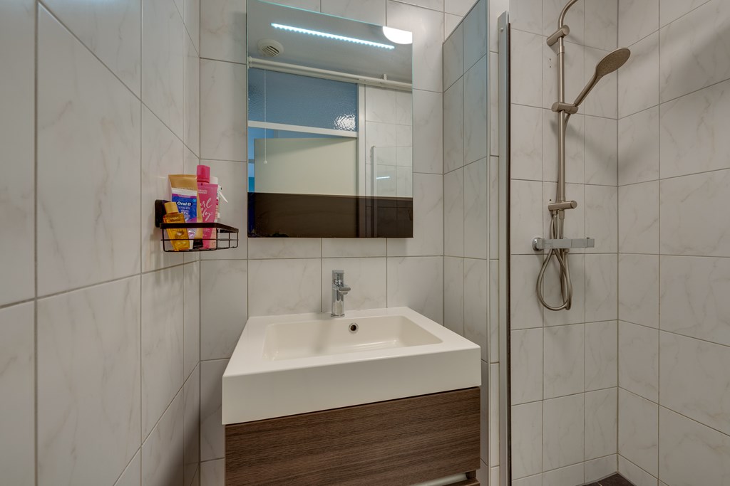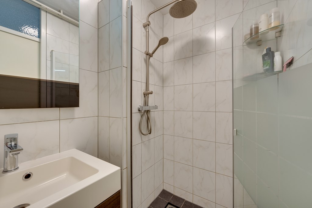 De moderne badkamer is stijlvol afgewerkt en bevindt zich centraal op de verdieping. Aan de voorzijde van de woning is de opstelplaats voor de wasmachine, de droger en de CV installatie (2019).