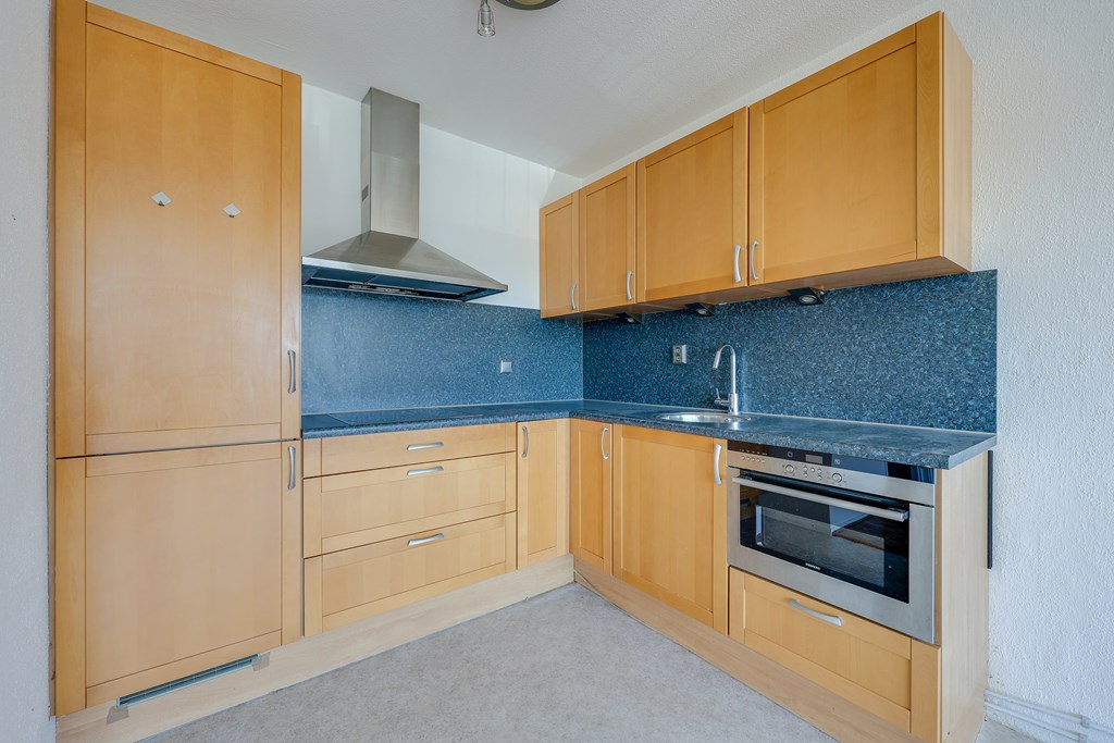 De open keuken is opgesteld in een praktische hoekopstelling en voorzien van diverse inbouwapparatuur en voldoende kastruimte.