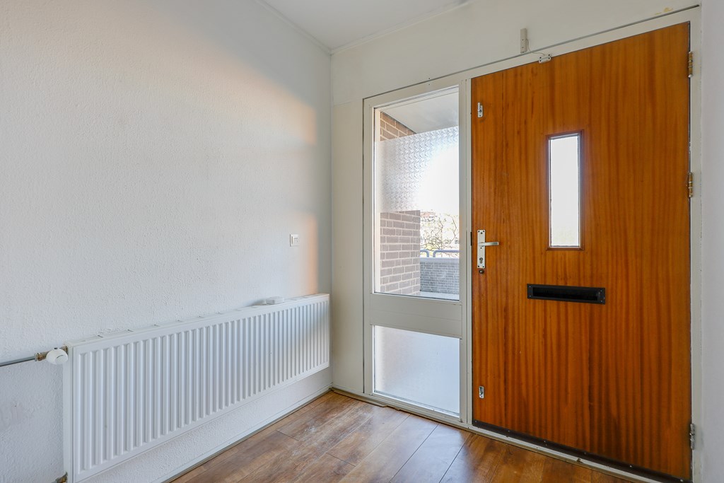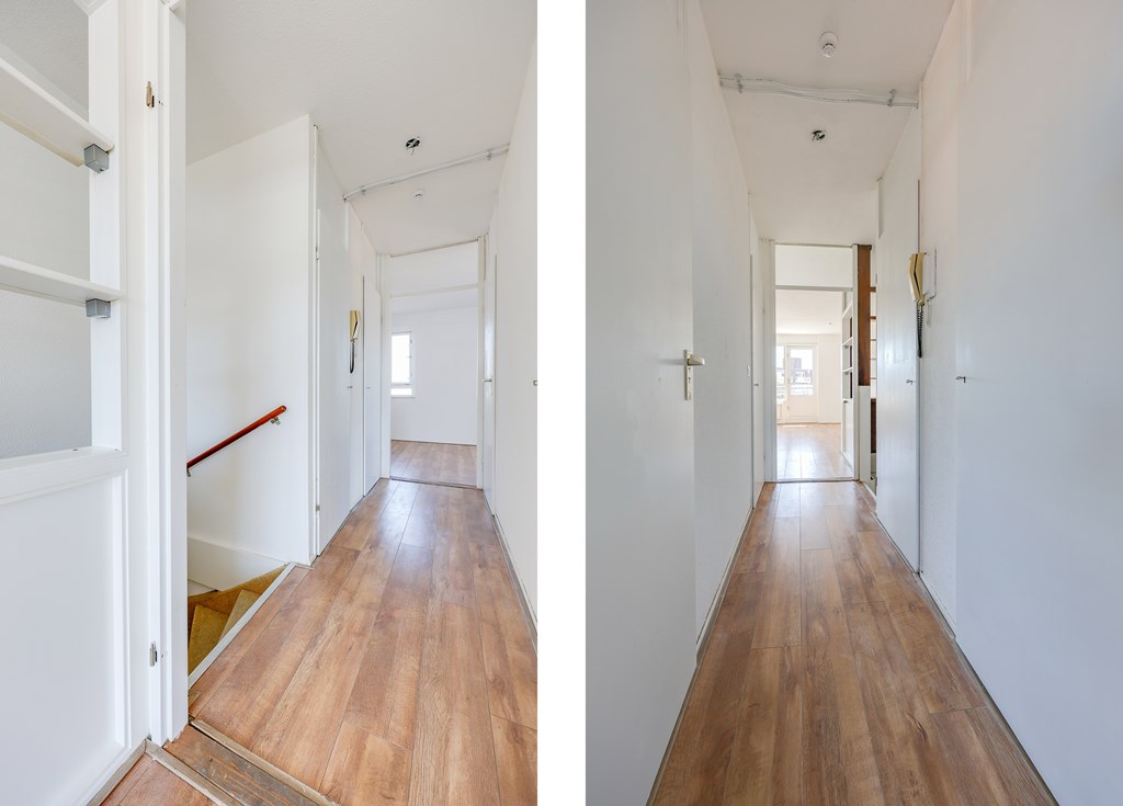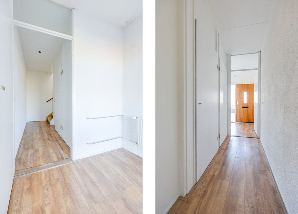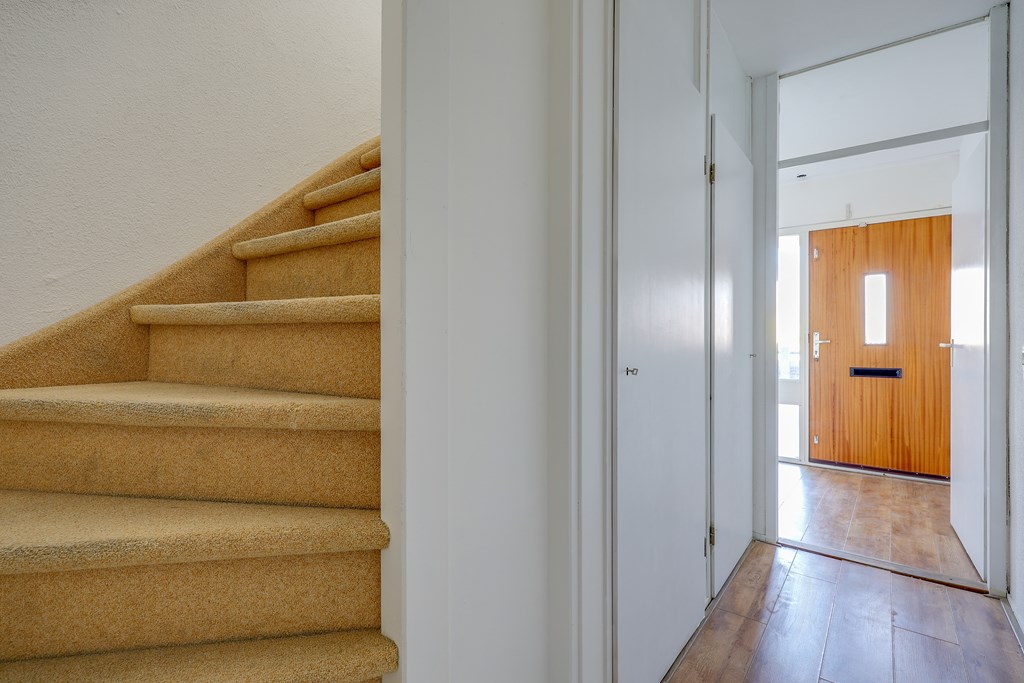 Je komt binnen in een ruime hal met meterkast, garderobekast en trapopgang naar de woonverdieping.