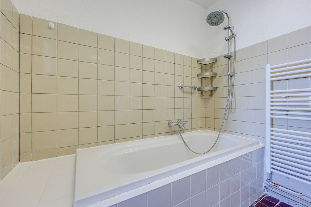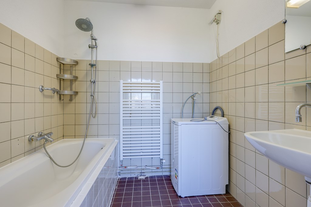 The bedroom is spacious (approx. 15 m²) and easy to furnish. Adjacent is the bathroom, fitted with a bathtub with hand shower, washbasin unit, and washing machine connection. The toilet is separate and located next to the bathroom on the landing.