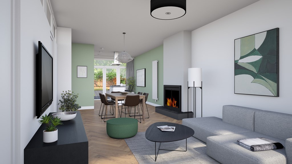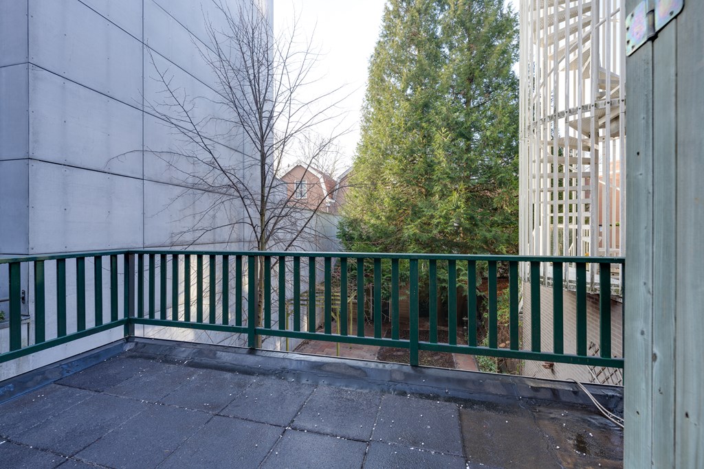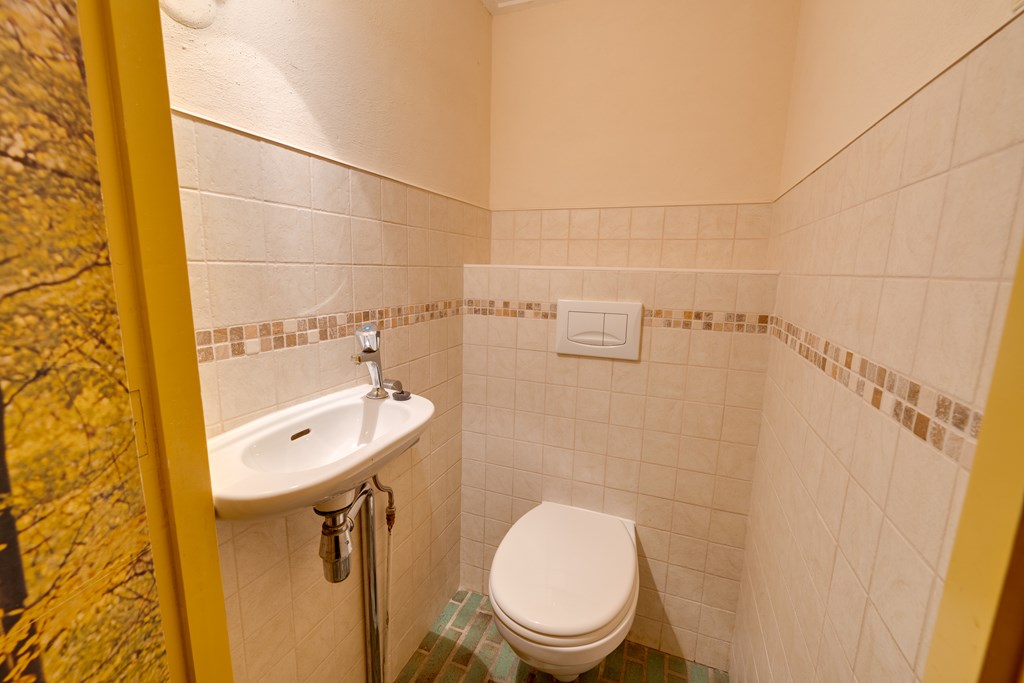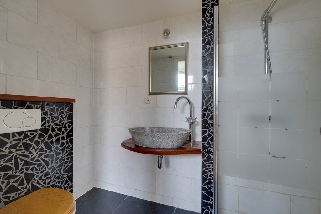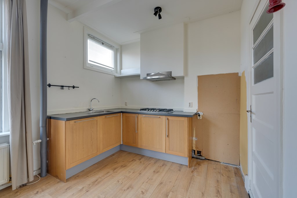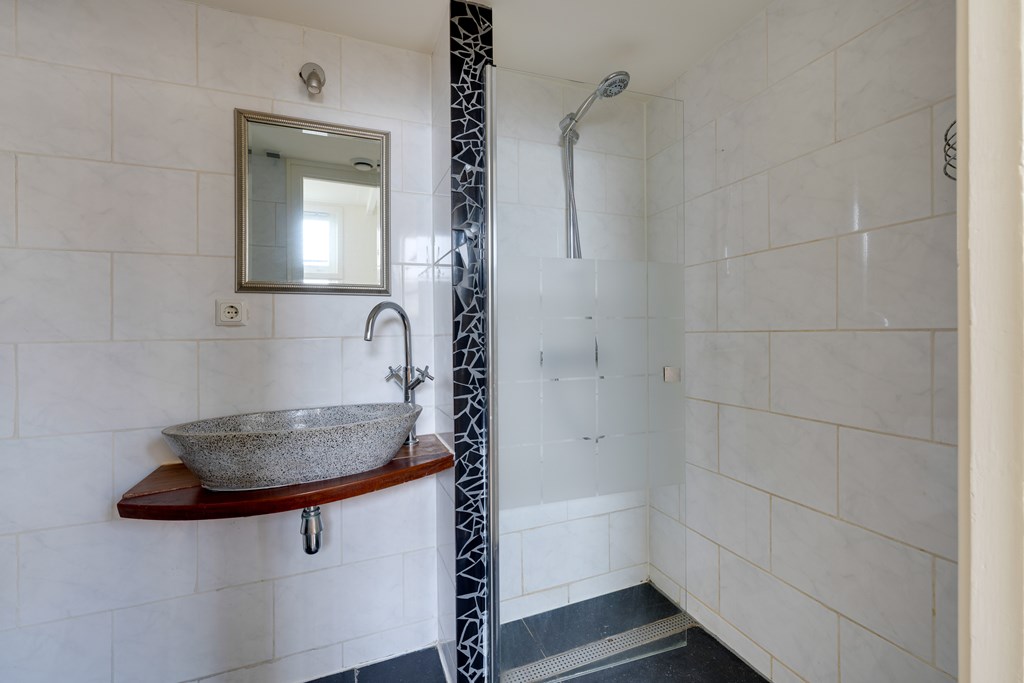 Op de begane grond vind je een ruime woonkamer met houten vloer en open haard. Aan de tuinzijde van de woning zit de keuken. Ook vind je hier de eerste badkamer met toilet. Via de hal betreed je de eerste verdieping, waar een volledig appartement met slaapkamer met aangrenzend dakterras, keuken en badkamer is gemaakt. Je vindt hier gestucte en geschilderde wanden en een nette laminaatvloer.