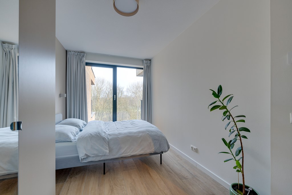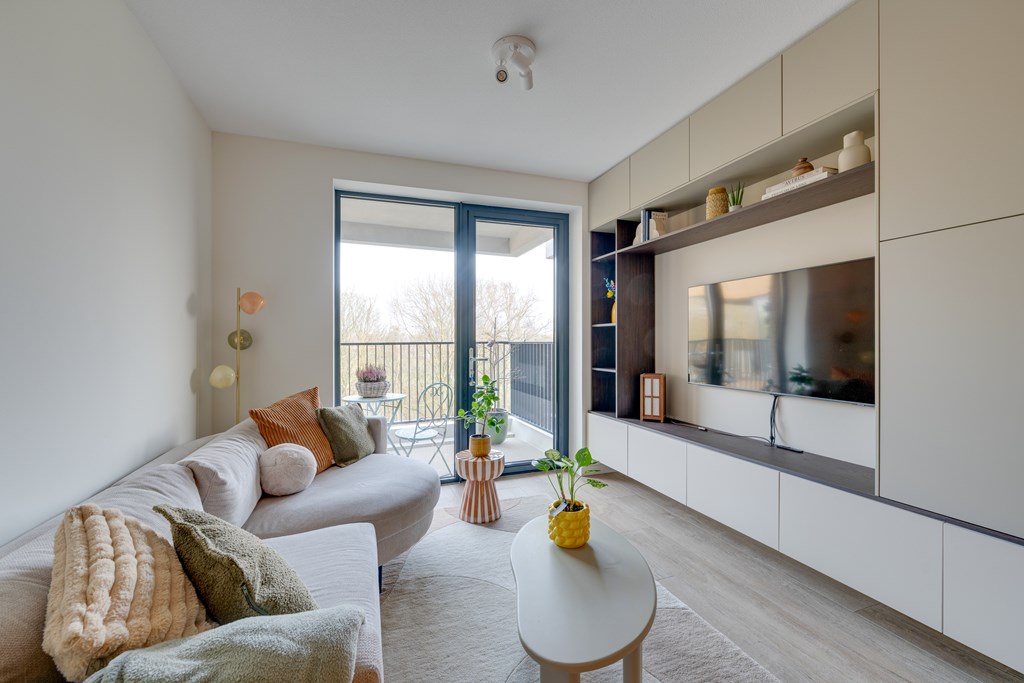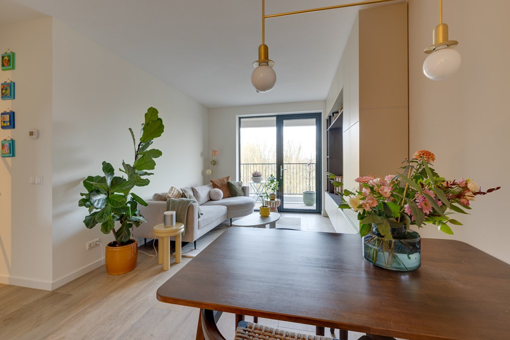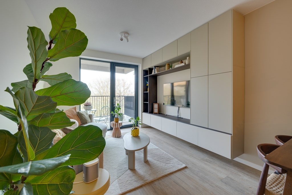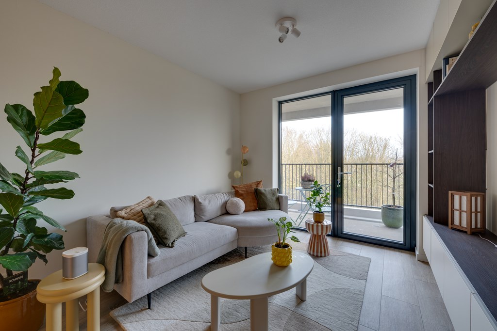 De woonkamer geeft toegang tot het balkon met vrij uitzicht op groen. Dankzij de grote raampartijen van vloer tot plafond stroomt het daglicht naar binnen en geniet u van een ruimtelijk gevoel.