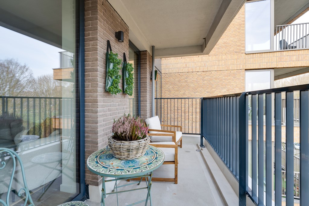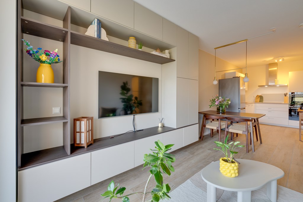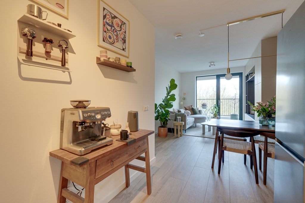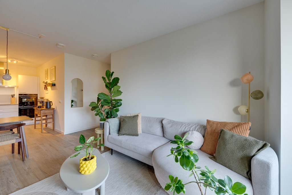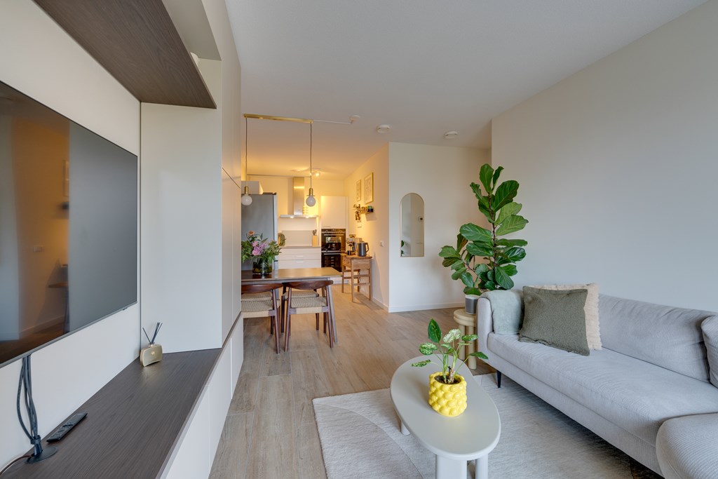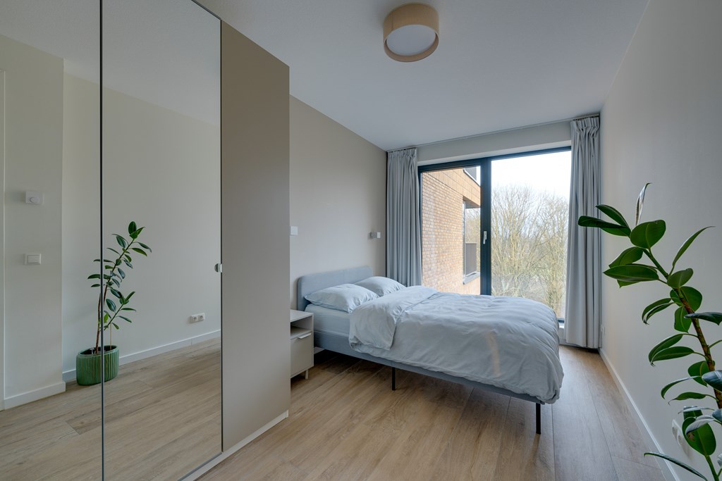 De woonkamer geeft toegang tot het balkon met vrij uitzicht op groen. Dankzij de grote raampartijen van vloer tot plafond stroomt het daglicht naar binnen en geniet u van een ruimtelijk gevoel.