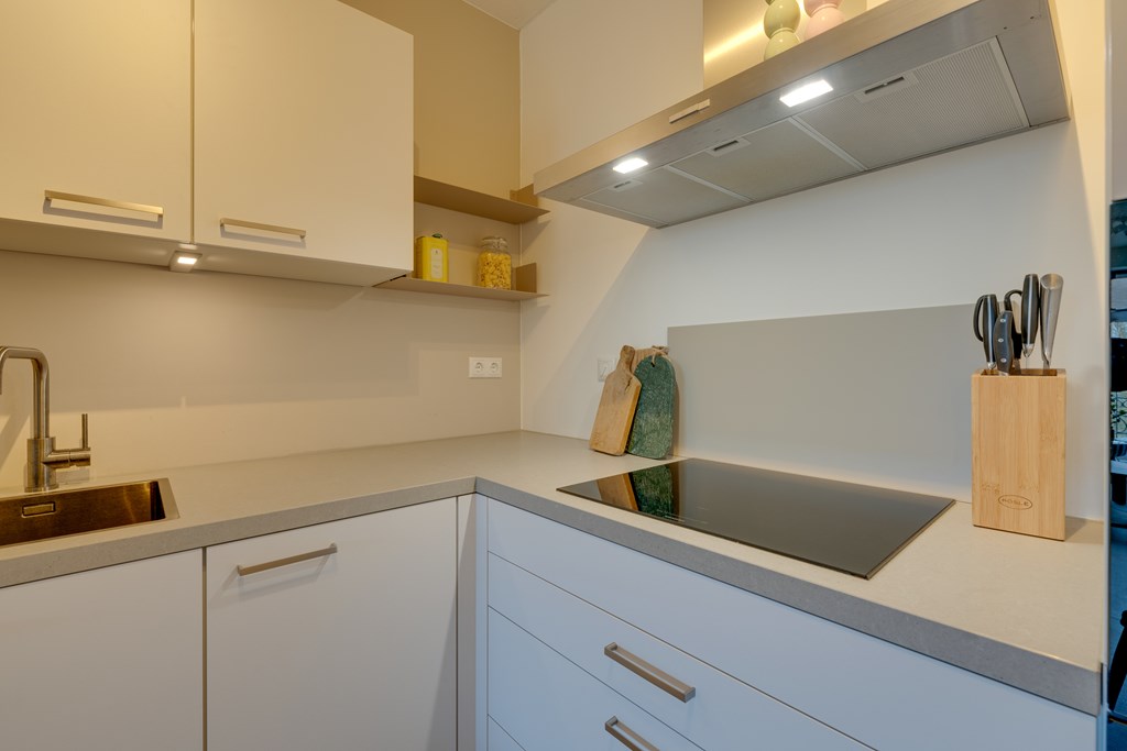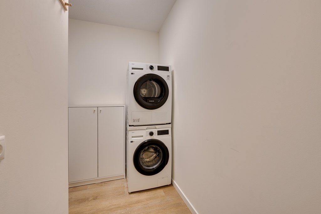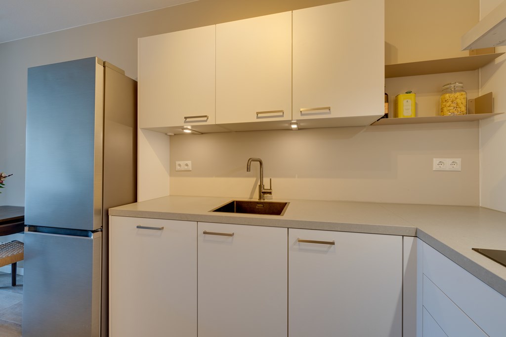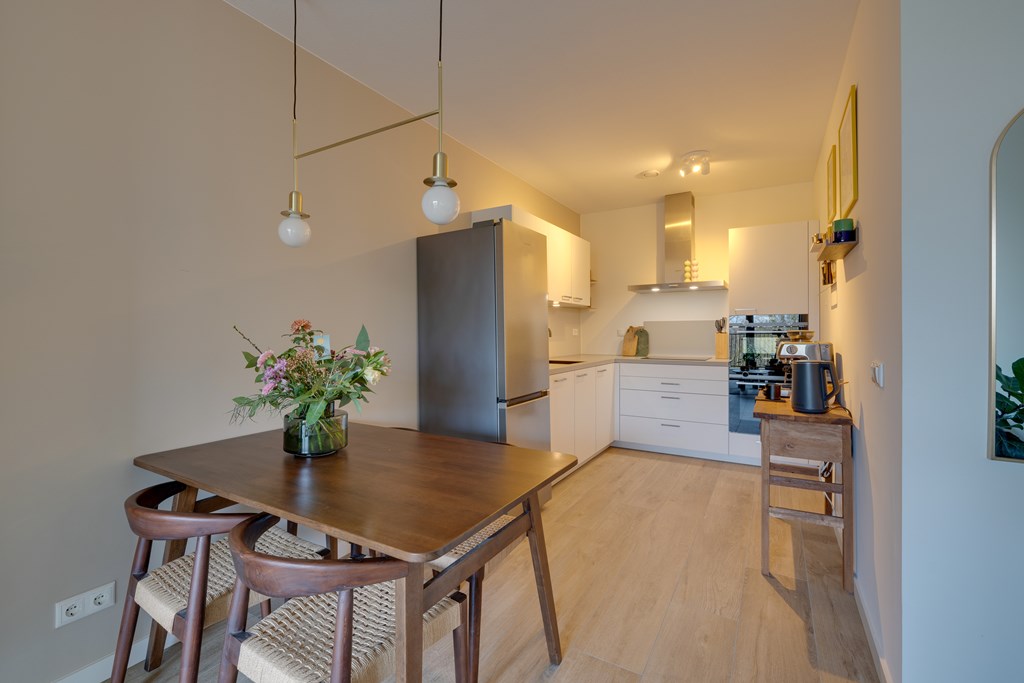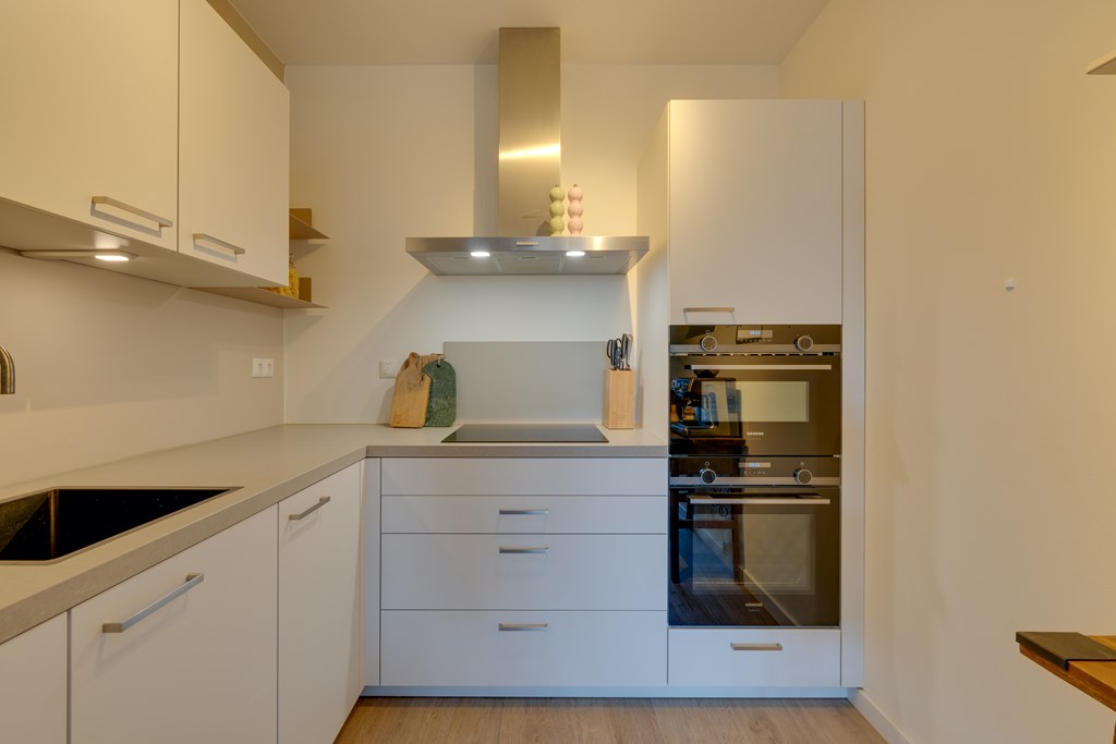 De hal beschikt over een separaat toilet en een ruime berging met aansluitmogelijkheden voor een wasmachine en droger. Vanuit de hal is er toegang tot de lichte woonkamer met een moderne open keuken. De keuken is uitgerust met hoogwaardige Siemens inbouwapparatuur, waaronder een inductiekookplaat, combimagnetron, een extra oven en vaatwasser.