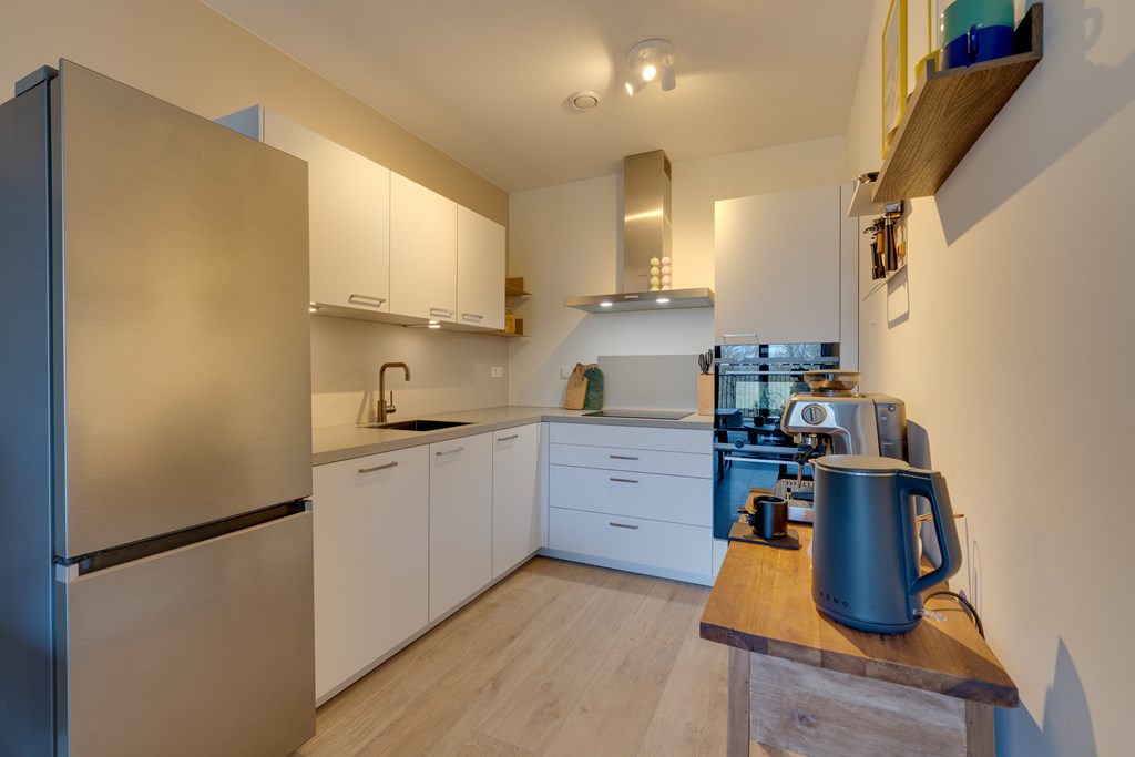 De gehele woning is strak afgewerkt met vliesbehang en schilderwerk. De vloer is voorzien van keramisch parket, wat zorgt voor een warme, sfeervolle uitstraling én onderhoudsgemak. Dit materiaal combineert de natuurlijke uitstraling van hout met de duurzaamheid van tegels, ideaal voor modern en comfortabel wonen. De woning is volledig voorzien van vloerverwarming wat perfect samenwerkt met het keramische parket en bijdraagt aan optimaal wooncomfort.