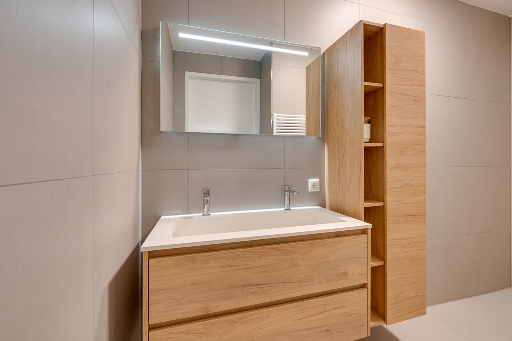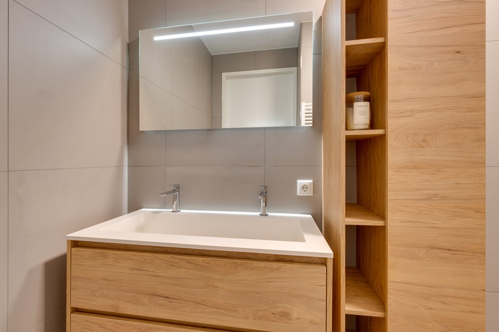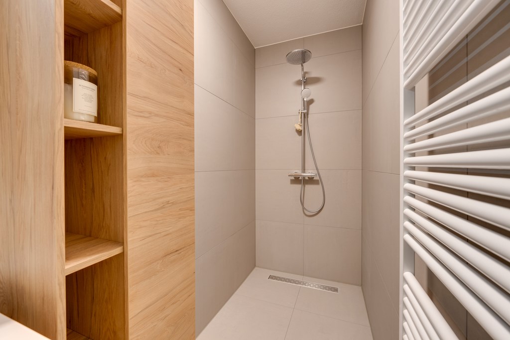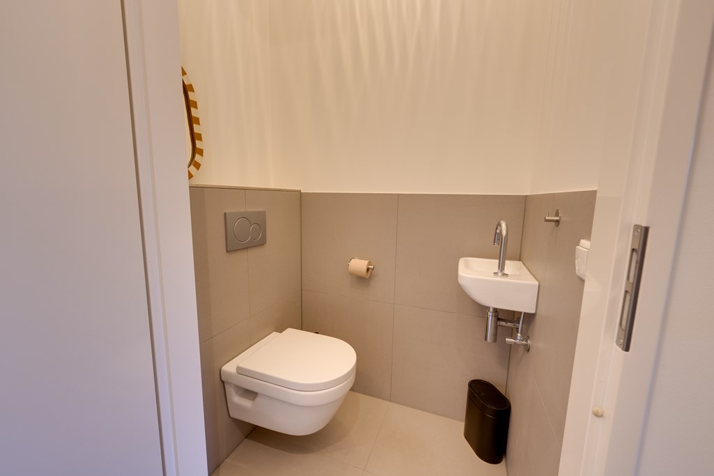 Vanuit de hal bereikt u tevens de moderne badkamer. Deze is geheel betegeld en voorzien van een ruime inloopdouche en een elektrische handdoekradiator. De strakke afwerking en hoogwaardige materialen geven de badkamer een tijdloze en luxe uitstraling.