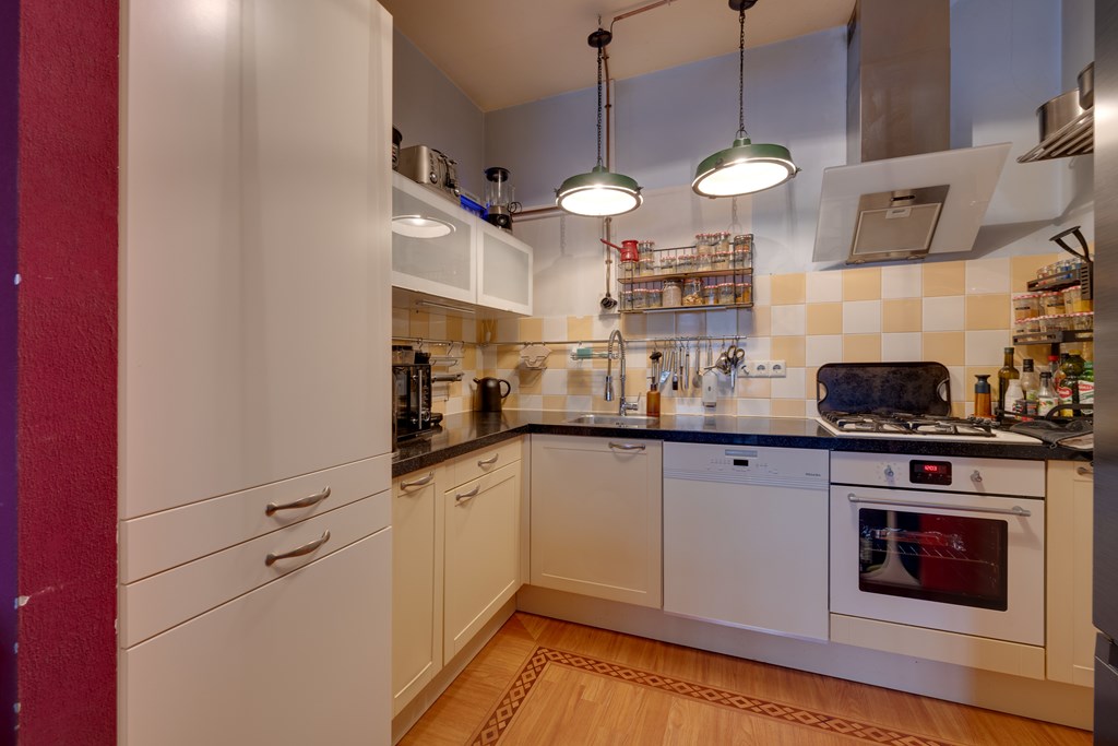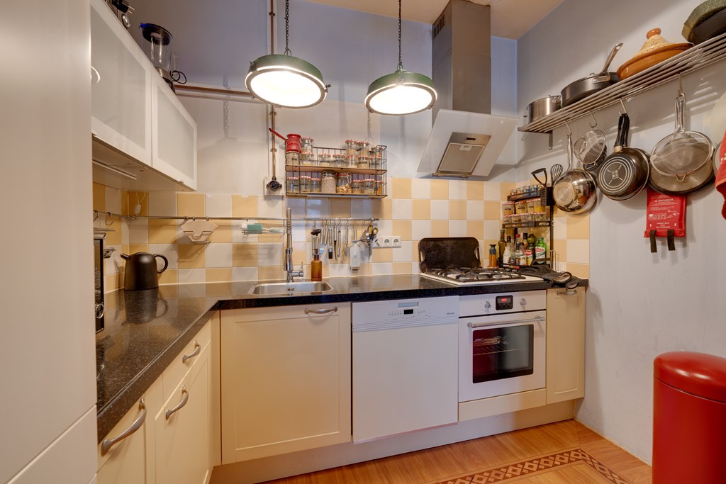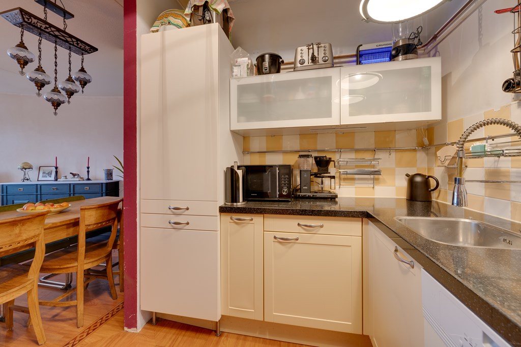 Aangrenzend aan de woonkamer vind je de nette keuken, die van alle gemakken is voorzien. De keuken beschikt over een gasfornuis, vaatwasser, afzuigkap en oven, alles wat je nodig hebt om heerlijk te koken. De praktische indeling biedt voldoende werk- en opbergruimte, terwijl de moderne uitstraling aansluit bij de rest van de woning.