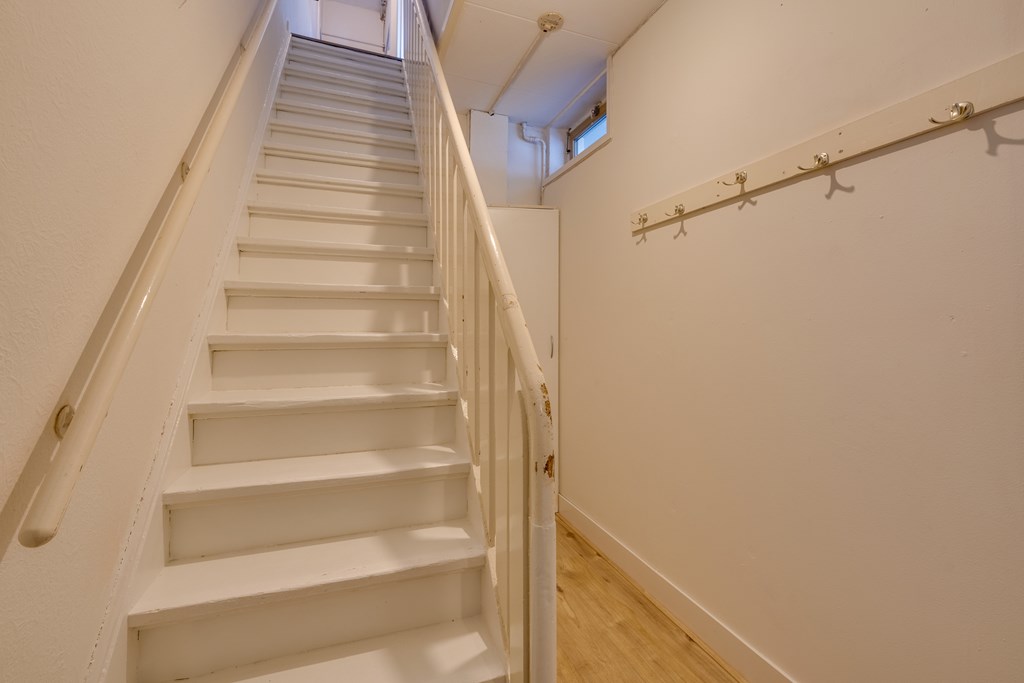 Through the entrance, which includes storage space and the meter cupboard, a fixed staircase leads to the upper-floor landing. On the right-hand side is access to the spacious and bright living room. From here, there is access to a smaller room at the front of the apartment, ideal as a home office or bedroom.