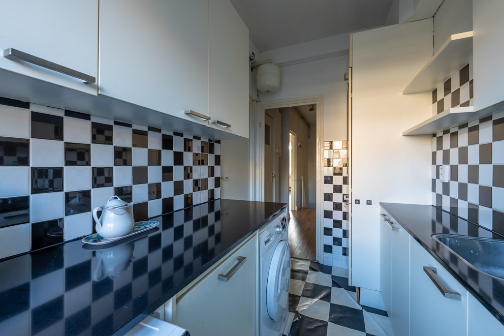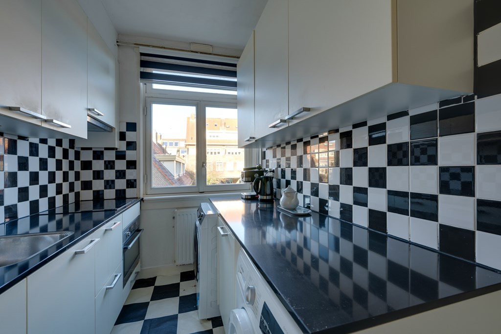 The kitchen is situated at the back of the apartment and is arranged in a practical parallel layout. It is fully equipped with built-in appliances including a dishwasher, induction cooktop, extractor hood, and fridge-freezer combination, as well as a luxury mixer tap. A washing machine and dryer are also located here. The kitchen is finished with a composite worktop.