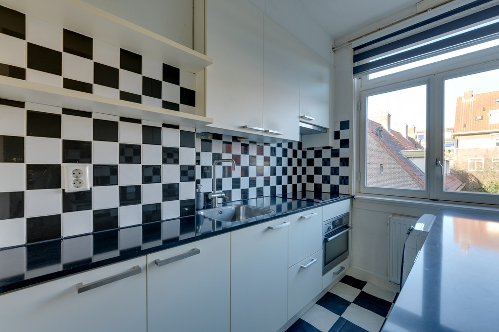De keuken is gesitueerd aan de achterzijde van de woning en uitgevoerd in een praktische parallelopstelling. Deze is voorzien van diverse inbouwapparatuur, waaronder een vaatwasser, inductiekookplaat, afzuiginstallatie en een koel-vriescombinatie, evenals een luxe mengkraan. Tevens zijn hier de wasmachine en droger opgesteld. Het geheel is afgewerkt met een composiet aanrechtblad.