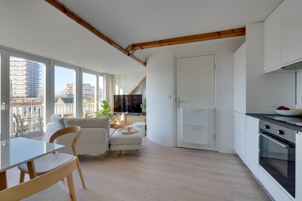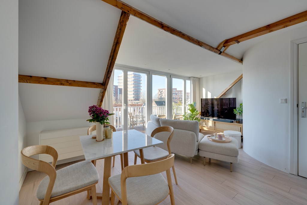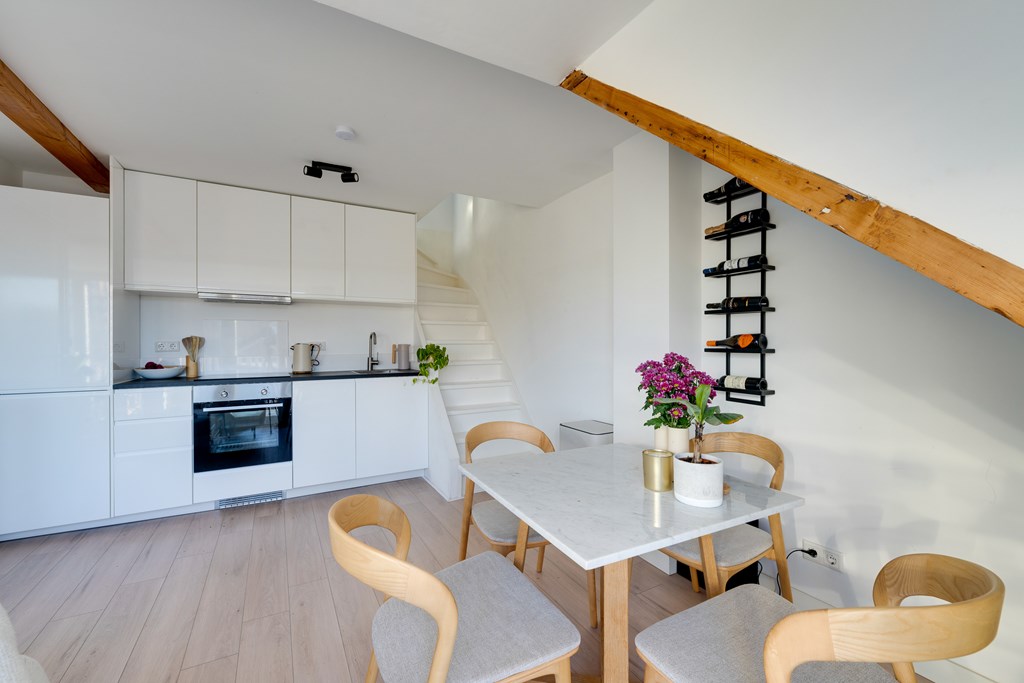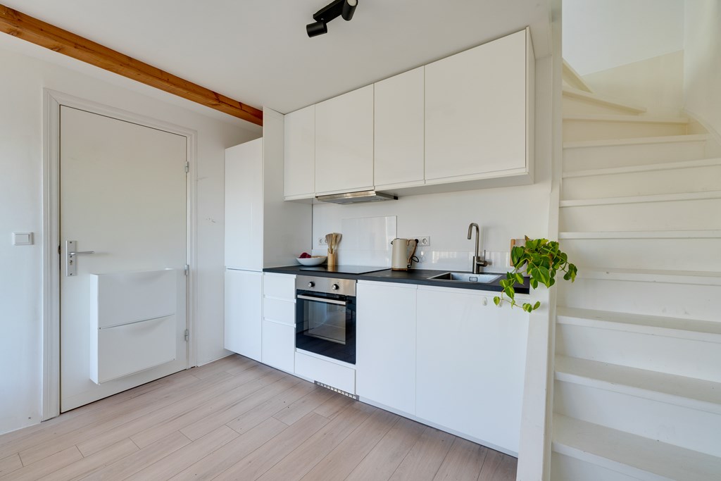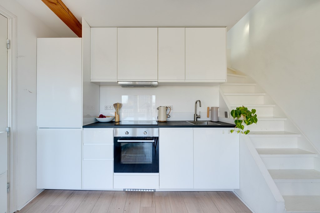 Zodra je binnenstapt, valt het lichte en open karakter van de woning direct op. De ruime woonkamer is voorzien van grote ramen die een sfeervol uitzicht bieden. Het hoge plafond en de open indeling geven de ruimte een prettige, moderne uitstraling, terwijl de authentieke details behouden zijn gebleven. Denk hierbij aan mooie houten balken. De open keuken sluit naadloos aan op de woonkamer en is praktisch ingericht met voldoende werkoppervlakte en opbergruimte. Het beschikt over een inductiekookplaat, vaatwasser en koelkast. Dit maakt het een fijne plek voor zowel dagelijkse maaltijden als uitgebreide diners met vrienden of familie.