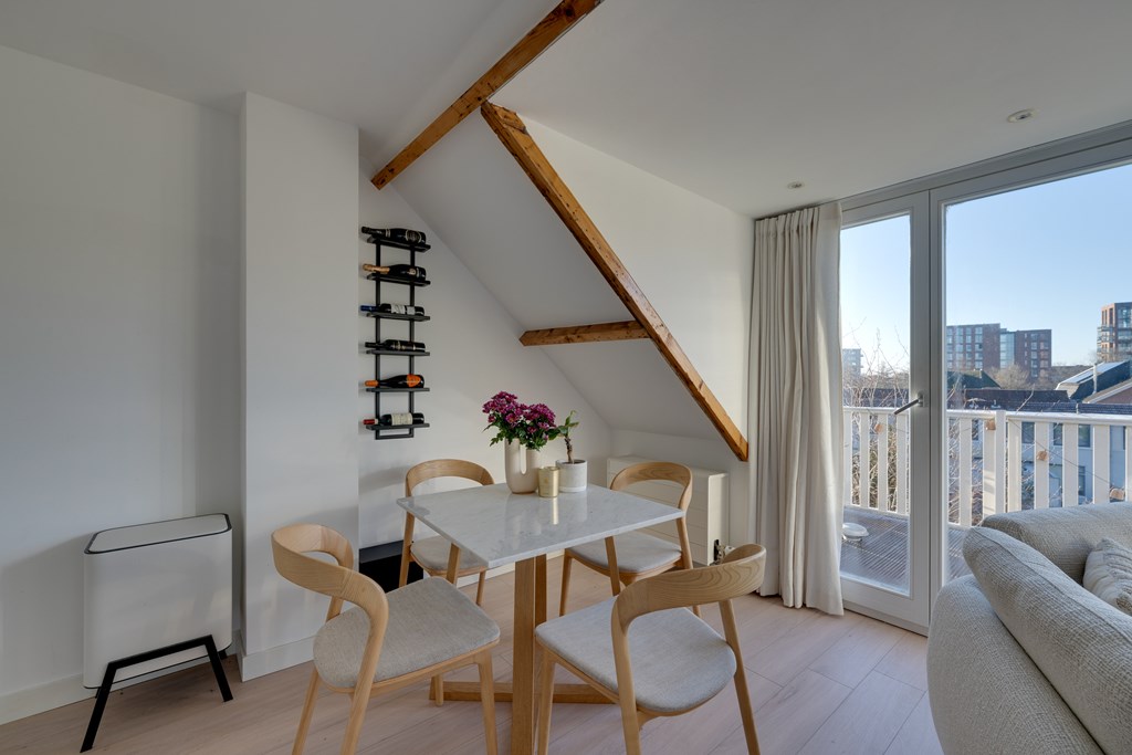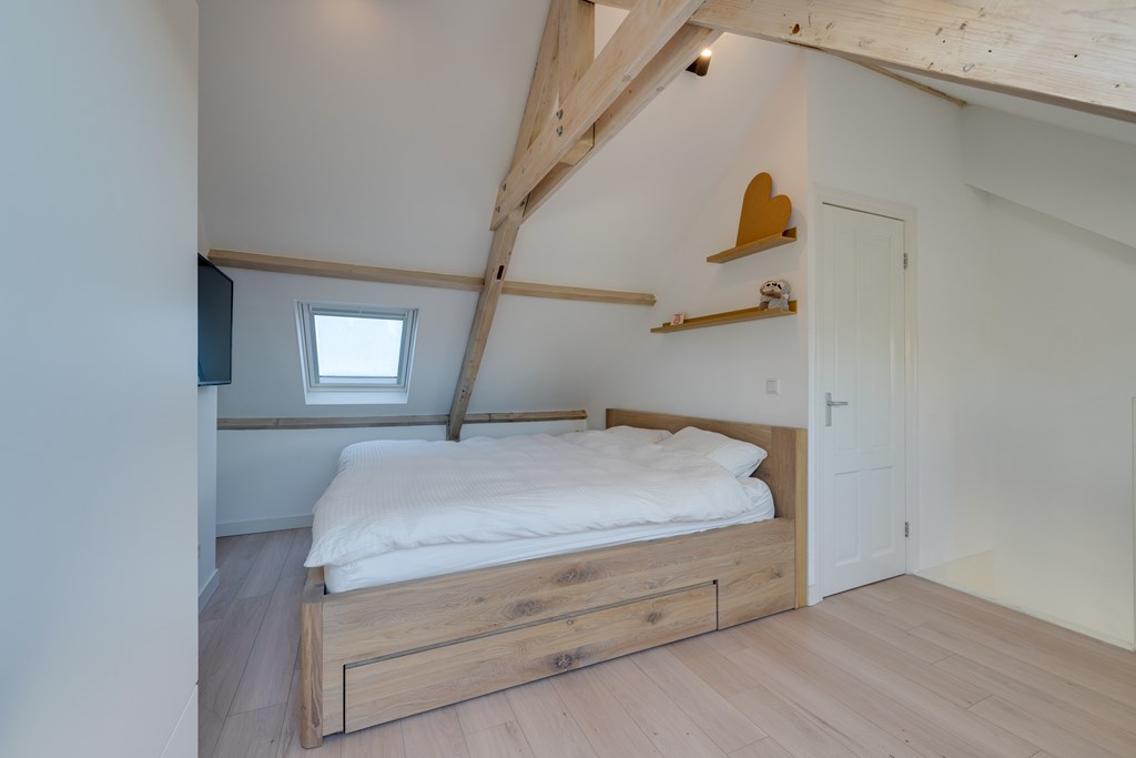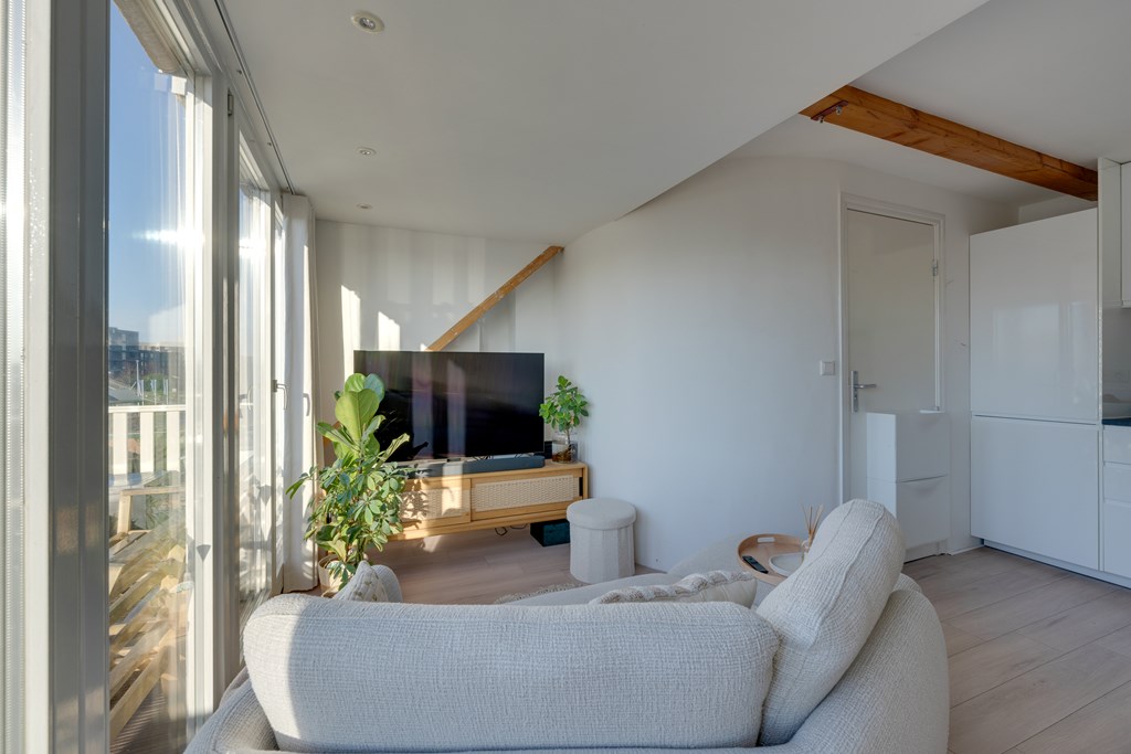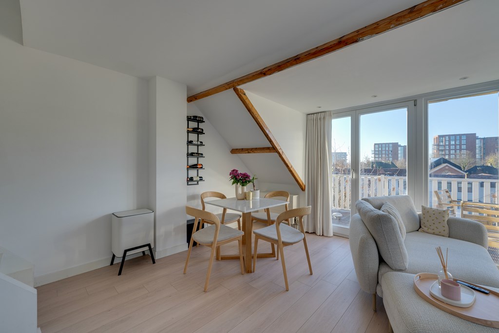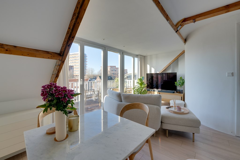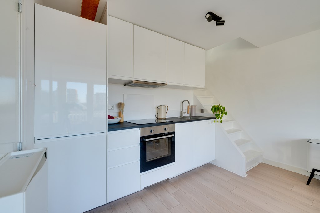 Zodra je binnenstapt, valt het lichte en open karakter van de woning direct op. De ruime woonkamer is voorzien van grote ramen die een sfeervol uitzicht bieden. Het hoge plafond en de open indeling geven de ruimte een prettige, moderne uitstraling, terwijl de authentieke details behouden zijn gebleven. Denk hierbij aan mooie houten balken. De open keuken sluit naadloos aan op de woonkamer en is praktisch ingericht met voldoende werkoppervlakte en opbergruimte. Het beschikt over een inductiekookplaat, vaatwasser en koelkast. Dit maakt het een fijne plek voor zowel dagelijkse maaltijden als uitgebreide diners met vrienden of familie.