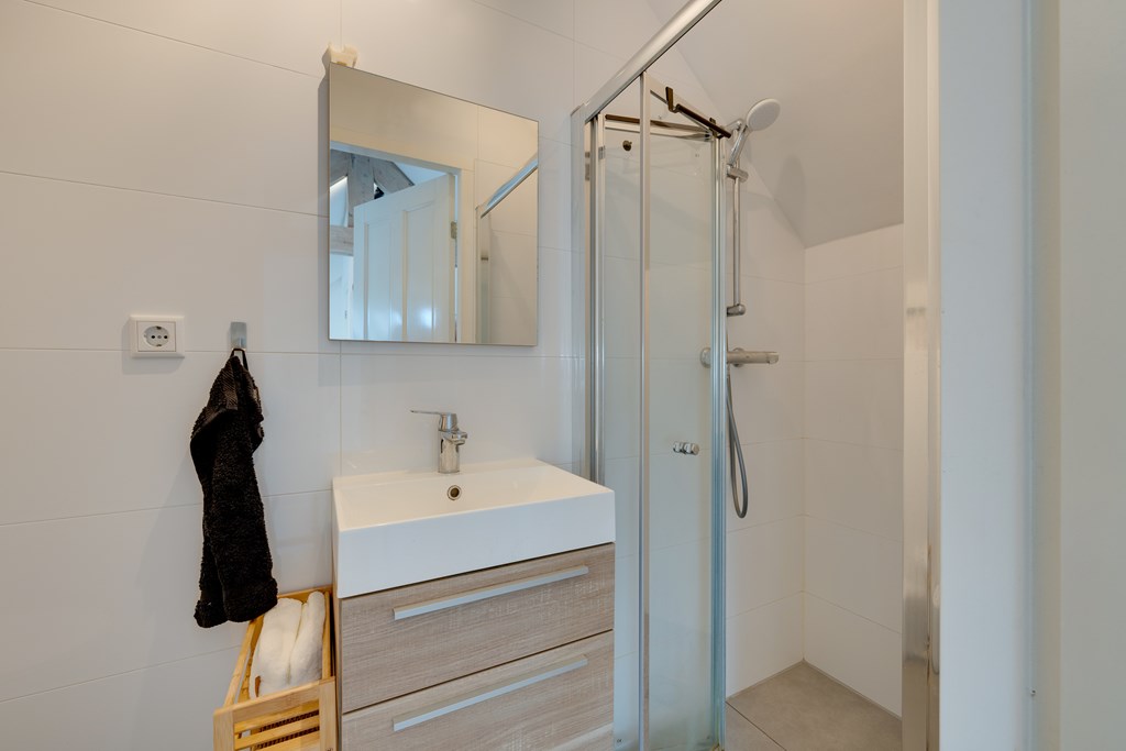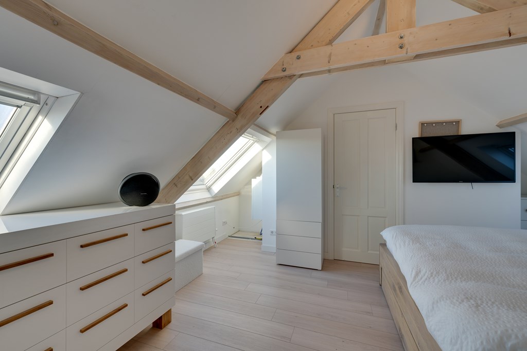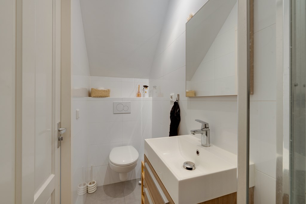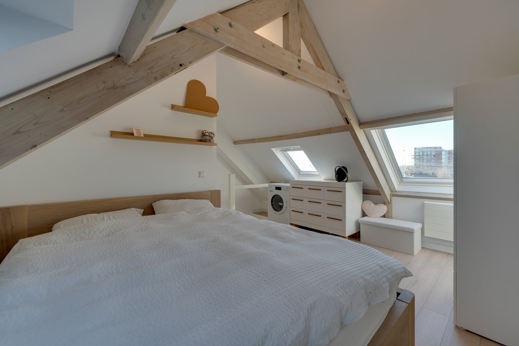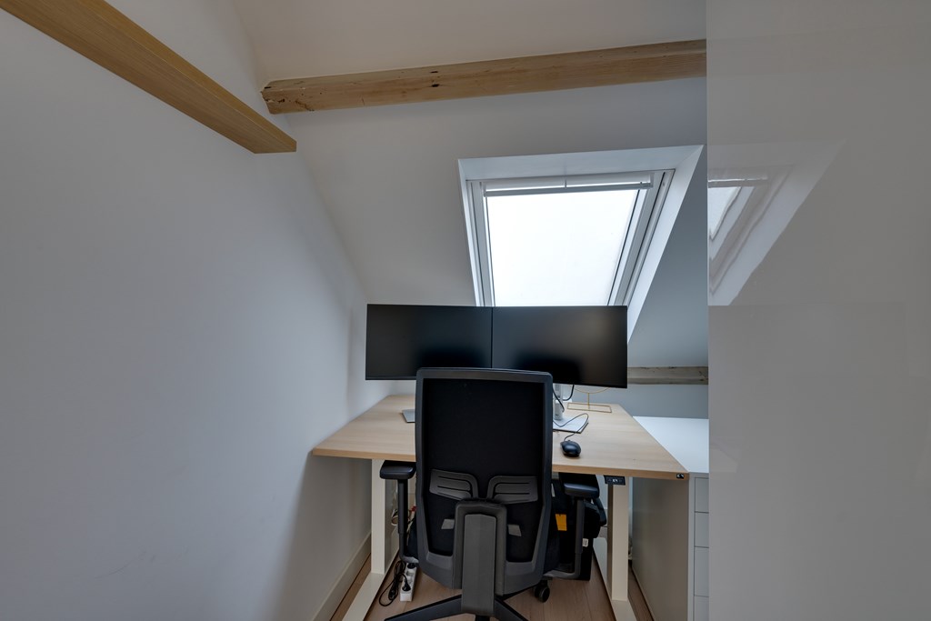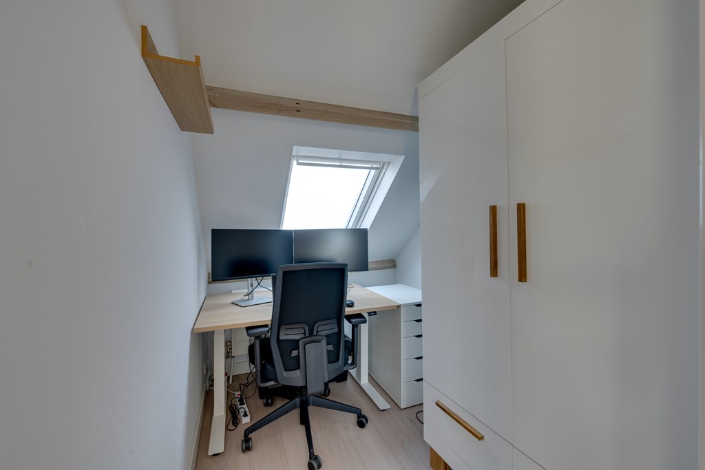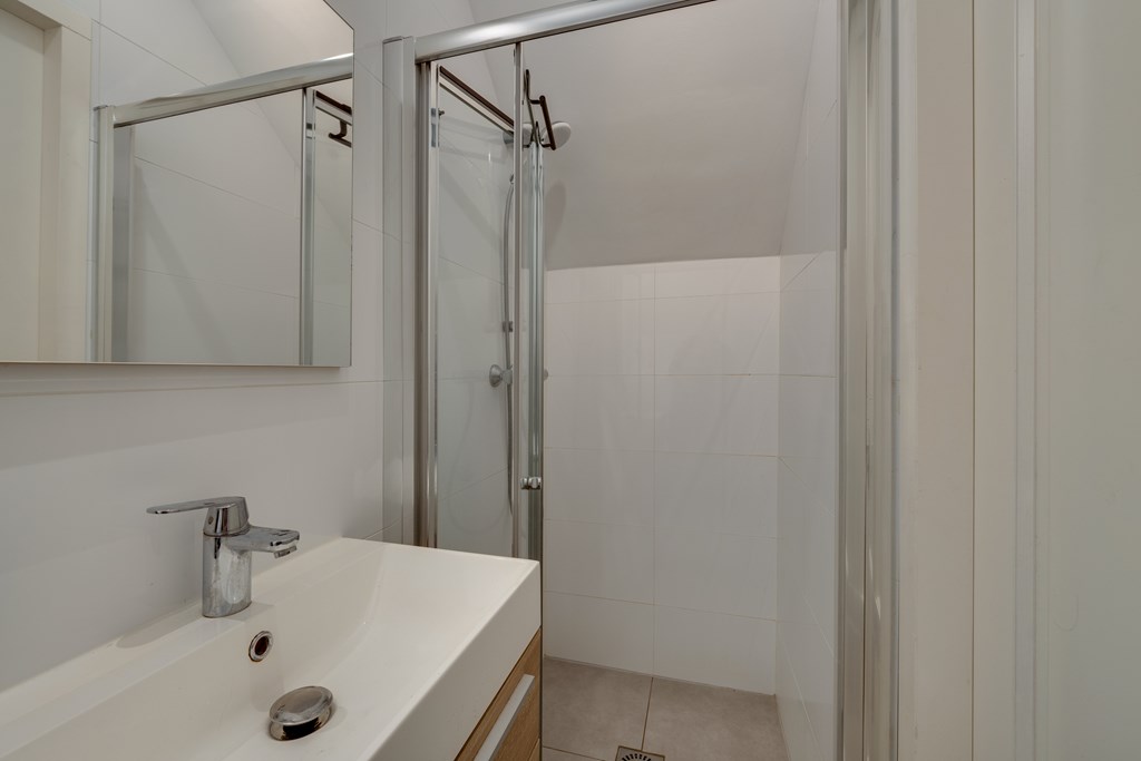 De slaapkamer bevindt zich aan de voorzijde van het appartement en biedt voldoende ruimte voor een groot bed, wasmachineopstelling en ook nog kastruimte. De moderne en betegelde badkamer is voorzien van een nette douche, wastafelmeubel, toilet en moderne afwerking. Alles voelt verzorgd en logisch ingedeeld, waardoor het appartement comfortabel is in dagelijks gebruik. Naast dit, heeft deze verdieping nog een kamer, die nu ingericht is al kantoor en kastruimte.
