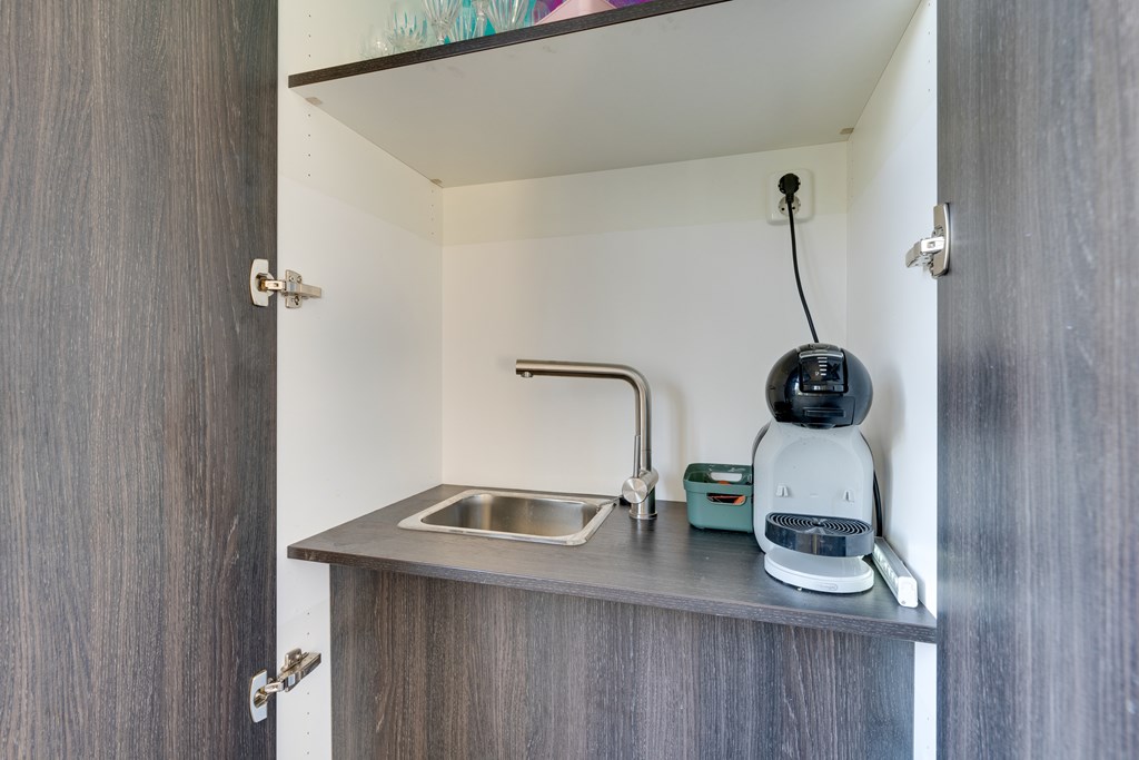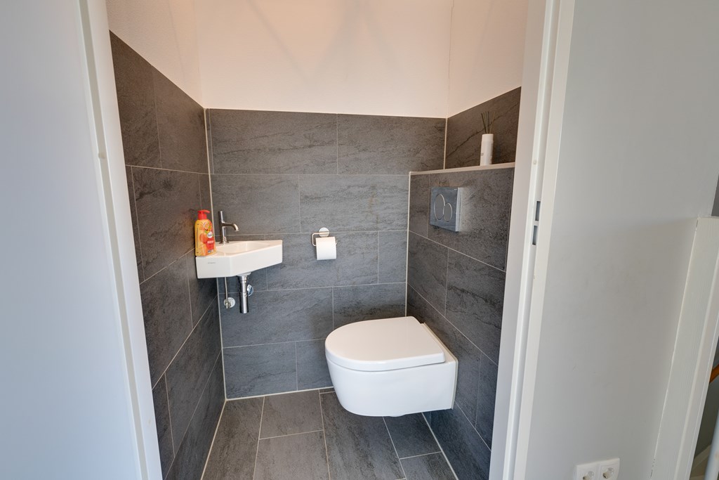You enter through the hallway, where you’ll find the meter cupboard and a separate toilet. From here, you access the modern kitchen with a cooking island—a clever and efficient use of space. The kitchen is equipped with all modern conveniences and serves as the heart of the home where cooking and socializing come together. It includes an induction cooktop with extractor hood, combi-microwave, oven, dishwasher, fridge, freezer, and coffee machine, all beautifully finished with a composite countertop.