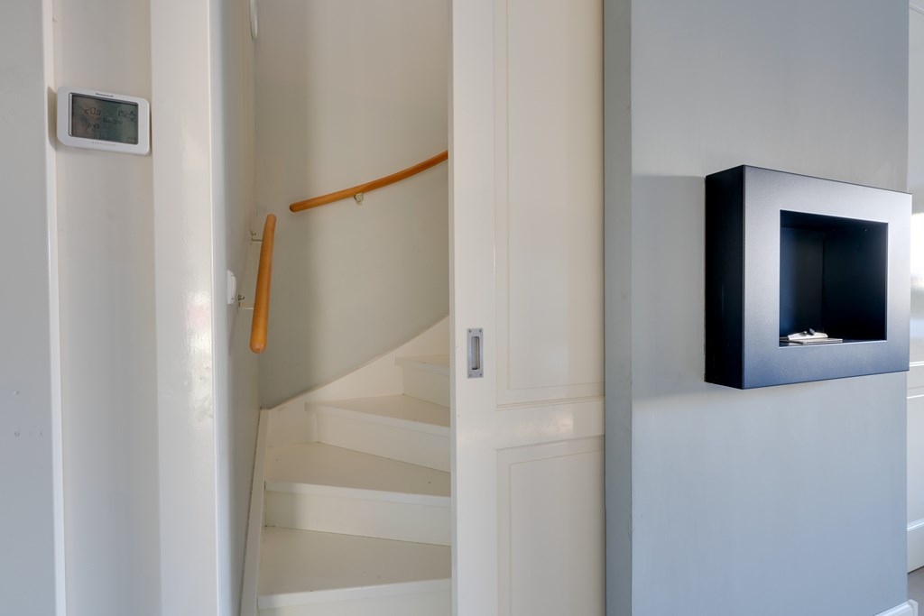 From the kitchen, you have direct access to the storage area and private parking spaces right outside, making it easy to park after a long day. There is also a large storage cupboard under the stairs next to the kitchen.