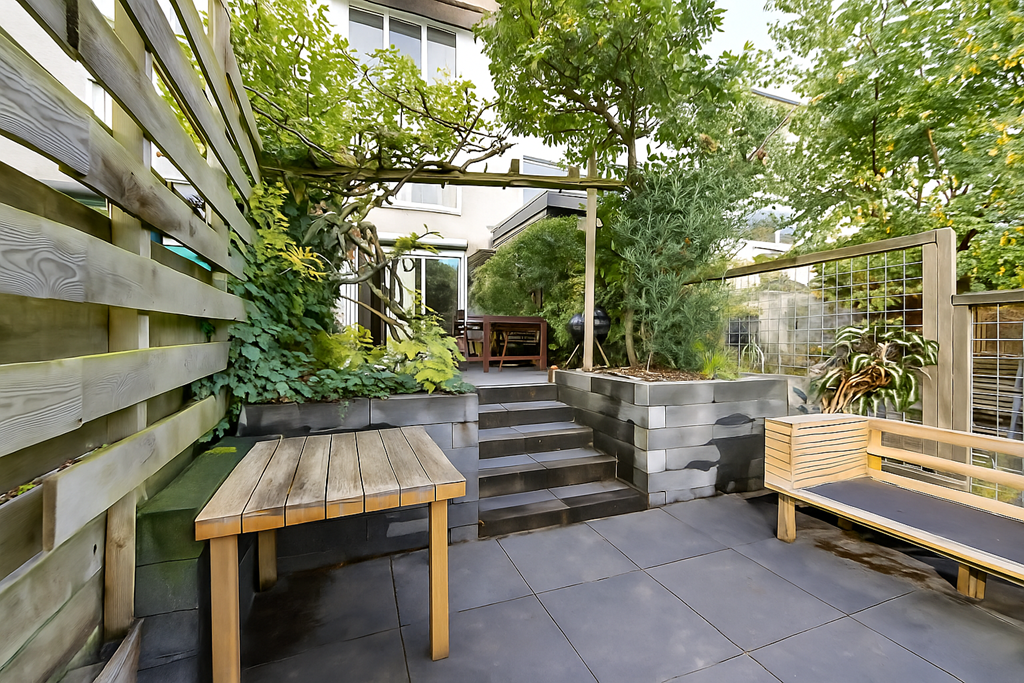 De diepe achtertuin ligt vrijwel geheel op het zuiden en grenst aan sierwater. Hierdoor is het er heerlijk zonnig, met volop privacy omdat er geen directe achterburen zijn. Een fijne plek om samen te komen met vrienden of familie, of om in alle rust te genieten van de prachtige omgeving.