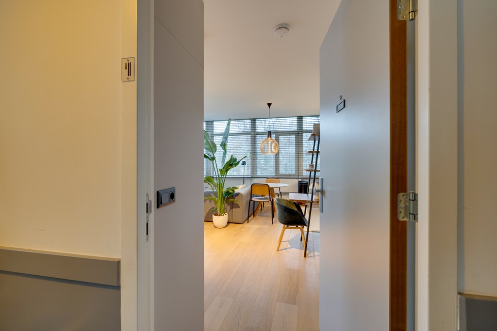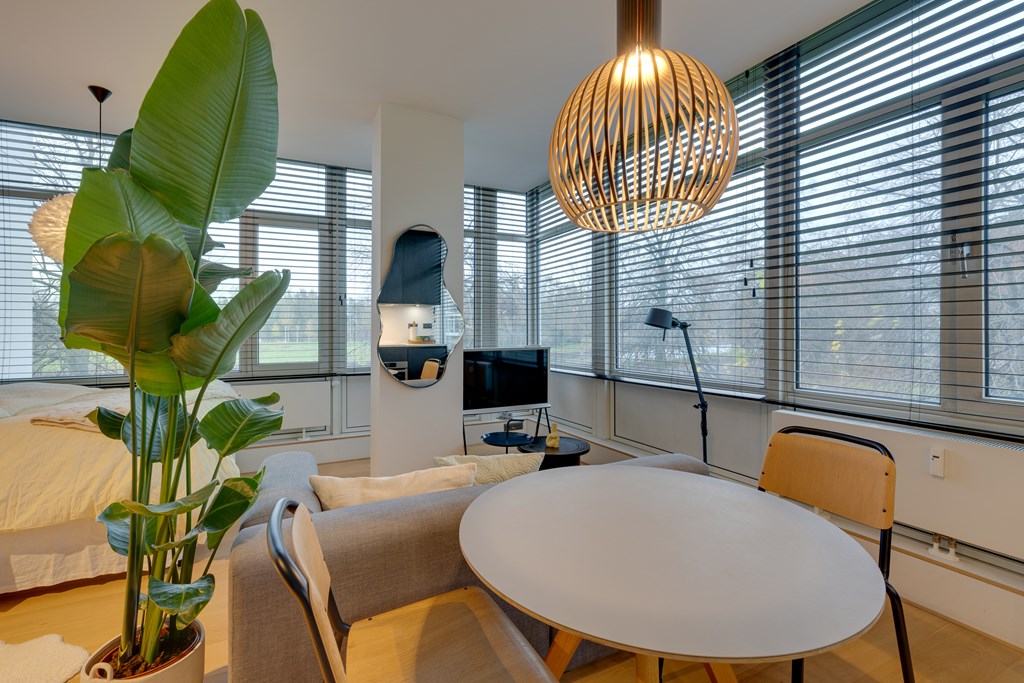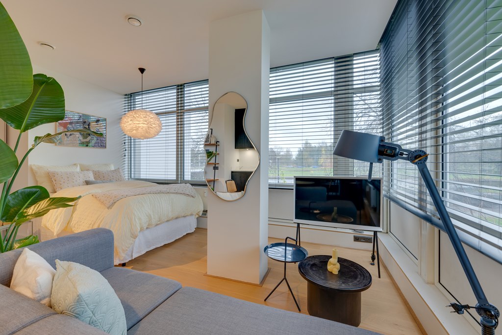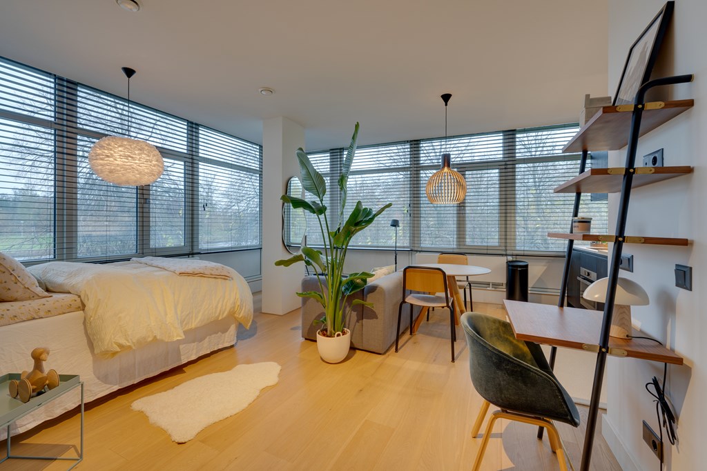 Bij binnenkomst valt vooral de extra hoeveelheid daglicht op, een groot voordeel van de hoekligging. Door ramen aan twee zijden voelt de studio ruimer aan en ontstaat een open, prettige sfeer. De vernieuwde vloerafwerking en strak gestuukte wanden zorgen voor een neutrale basis, waardoor het appartement eenvoudig naar eigen stijl is in te richten.