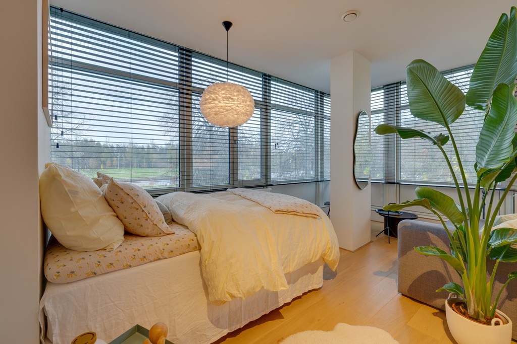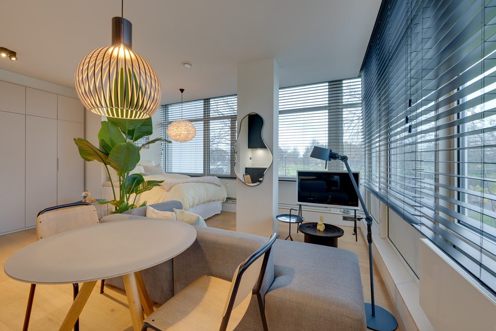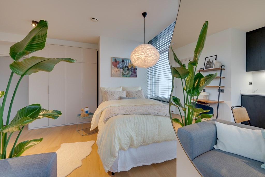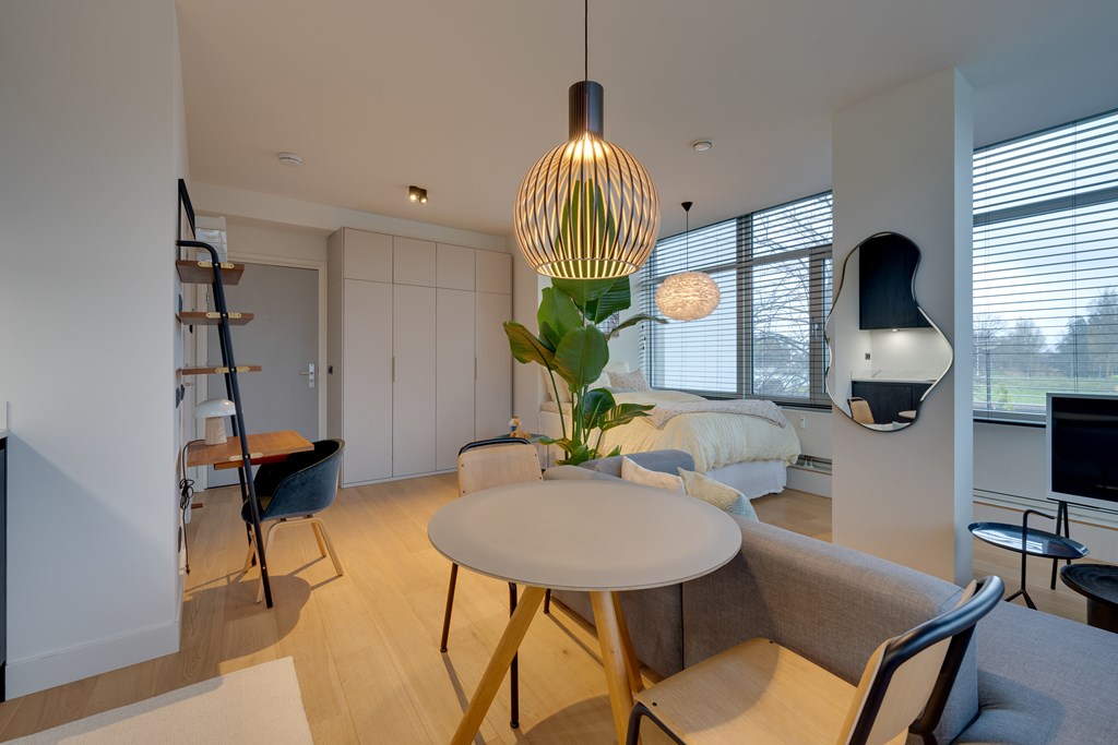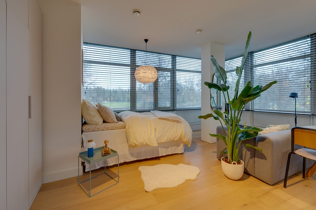 Bij binnenkomst valt vooral de extra hoeveelheid daglicht op, een groot voordeel van de hoekligging. Door ramen aan twee zijden voelt de studio ruimer aan en ontstaat een open, prettige sfeer. De vernieuwde vloerafwerking en strak gestuukte wanden zorgen voor een neutrale basis, waardoor het appartement eenvoudig naar eigen stijl is in te richten.