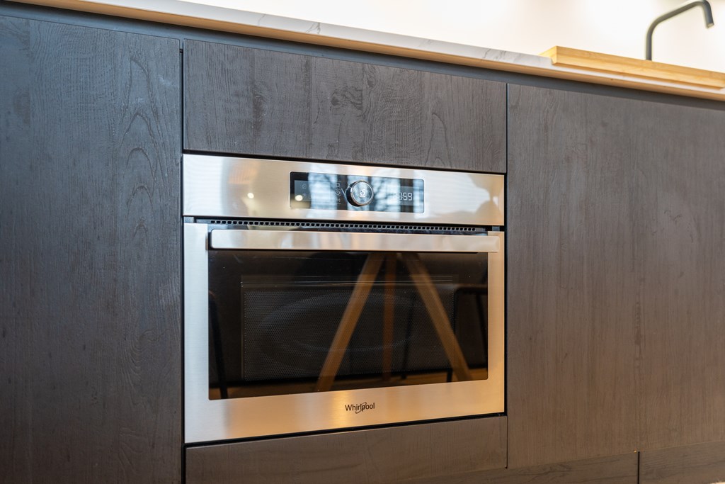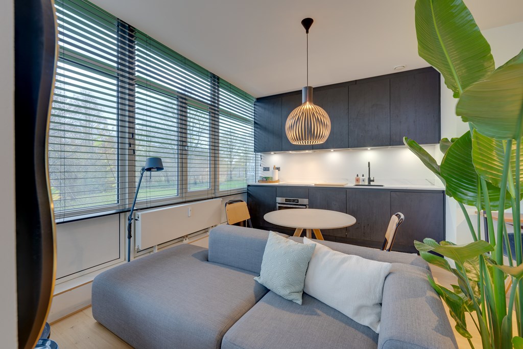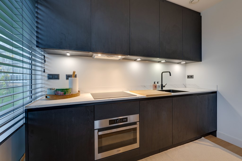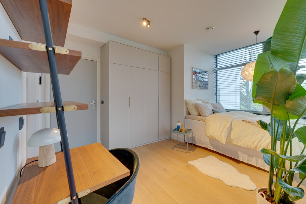 De moderne open keuken is uitgerust met hoogwaardige inbouwapparatuur, waaronder een inductiekookplaat, vaatwasser, combioven, koelkast en vriezer. Ook biedt de keuken voldoende opbergruimte en is afgewerkt met een prachtig natuurstenen blad. Hierdoor kun je in alle comfort koken zonder dat de compacte leefruimte onrustig oogt. De keuken sluit harmonieus aan op de woon- en slaapruimte, die dankzij de hoekligging flexibel in te delen is. Het appartement beschikt over een mooie houten vloer. Een zitgedeelte, werkplek en slaapgedeelte zijn gemakkelijk te combineren, waarbij de grote ramen het geheel een uitnodigende en lichte uitstraling geven.