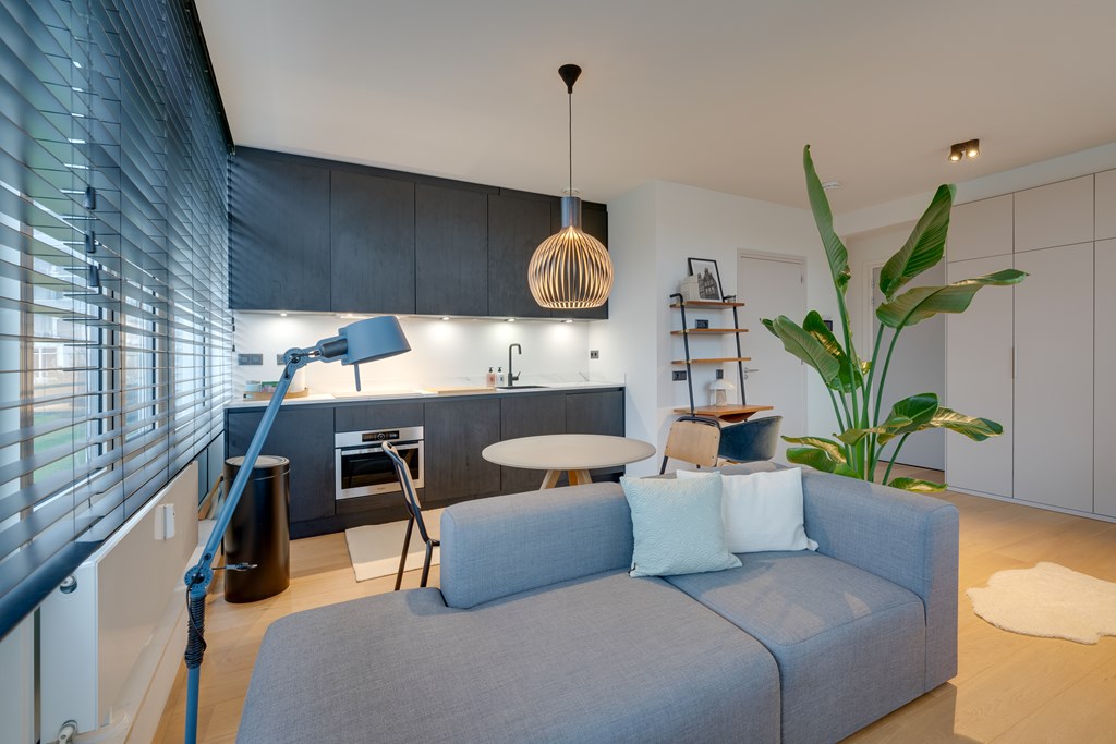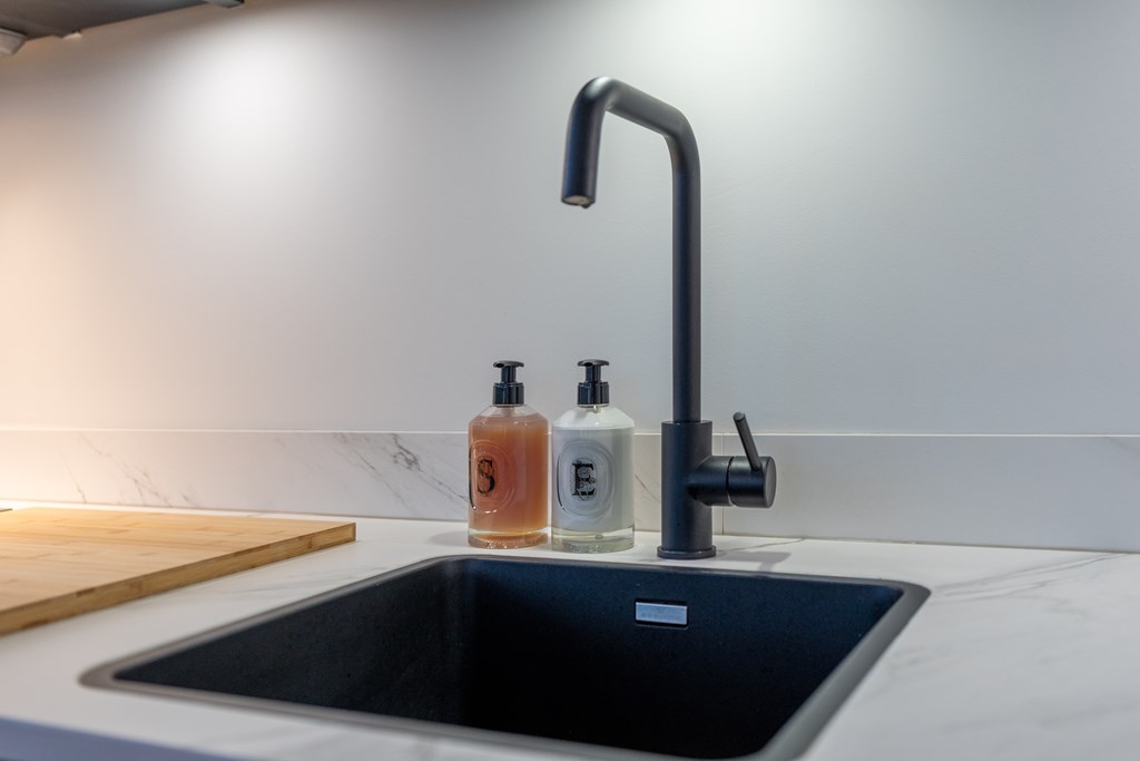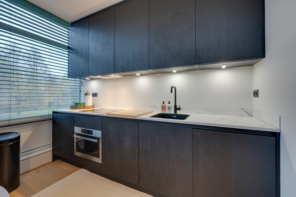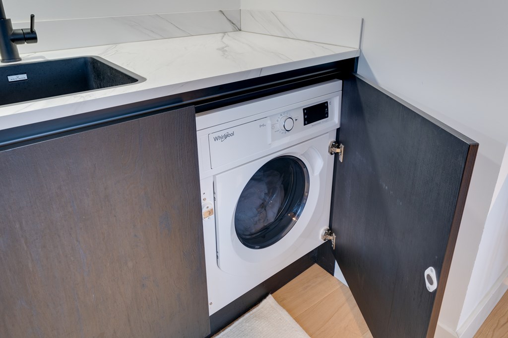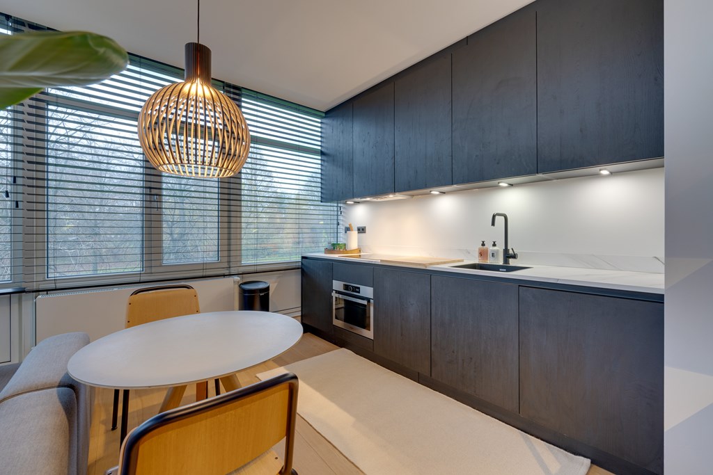 De moderne open keuken is uitgerust met hoogwaardige inbouwapparatuur, waaronder een inductiekookplaat, vaatwasser, combioven, koelkast en vriezer. Ook biedt de keuken voldoende opbergruimte en is afgewerkt met een prachtig natuurstenen blad. Hierdoor kun je in alle comfort koken zonder dat de compacte leefruimte onrustig oogt. De keuken sluit harmonieus aan op de woon- en slaapruimte, die dankzij de hoekligging flexibel in te delen is. Het appartement beschikt over een mooie houten vloer. Een zitgedeelte, werkplek en slaapgedeelte zijn gemakkelijk te combineren, waarbij de grote ramen het geheel een uitnodigende en lichte uitstraling geven.