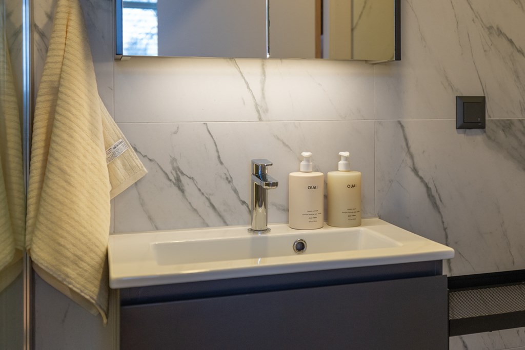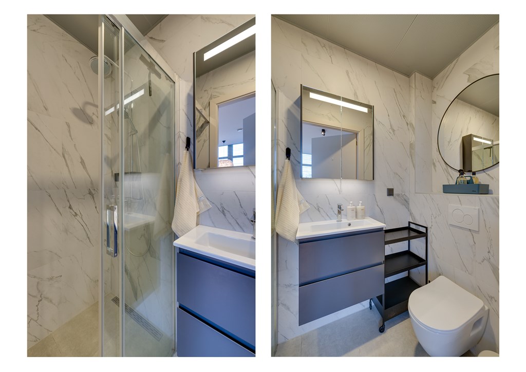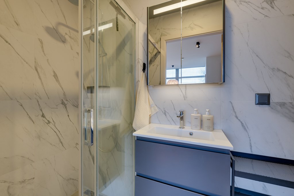 De badkamer, eveneens vernieuwd in 2022, is voorzien van een moderne douche, wastafelmeubel en toilet. Met strakke tegels en kwalitatieve materialen heeft deze ruimte een geweldige uitstraling die helemaal past bij de rest van het appartement.