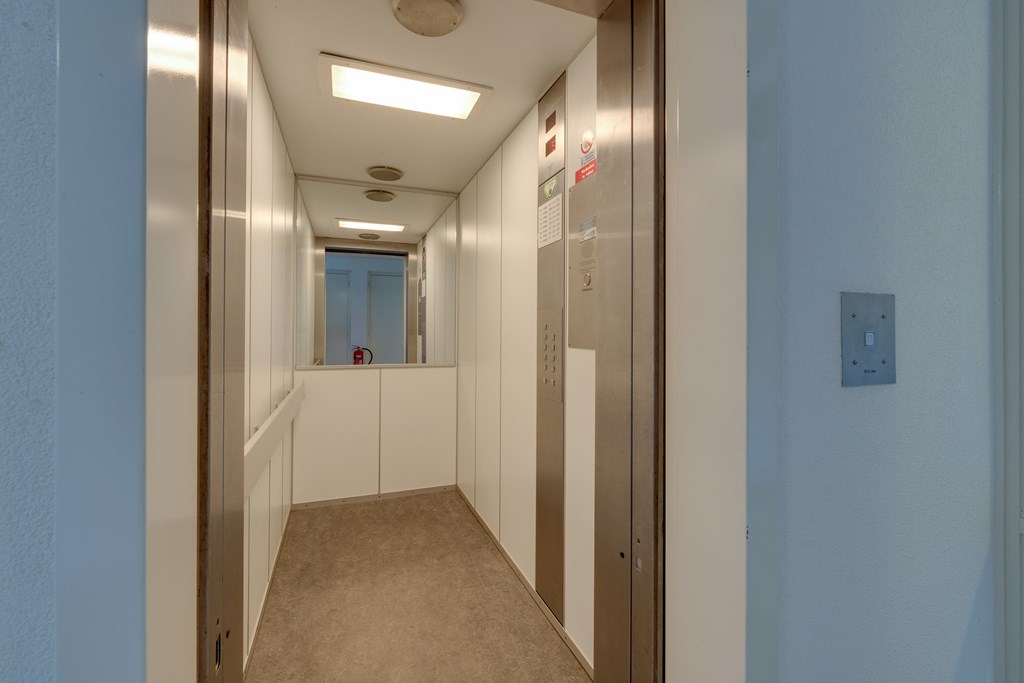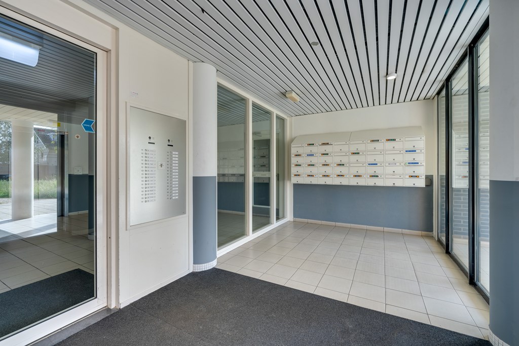 Gemeenschappelijke entree met video-intercomsysteem, brievenbussen, lift en trappenhuis. Hier bevindt zich tevens de eigen berging. Achter het gebouw ligt het afgesloten parkeerterrein van de VvE, waar bewoners gratis kunnen parkeren. Dit terrein is met een op afstand bedienbare slagboom afgesloten van de openbare weg. Bezoek kan zoals eerder aangegeven gratis parkeren op een van de vele plekken in de omgeving.