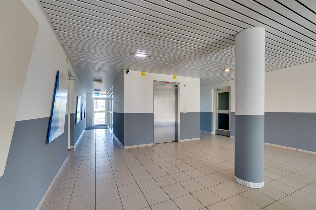 Communal entrance with video intercom system, mailboxes, lift, and staircase. You’ll also find your private storage room here. Behind the building is the residents’ parking area, secured by a remote-controlled barrier, where residents can park free of charge.