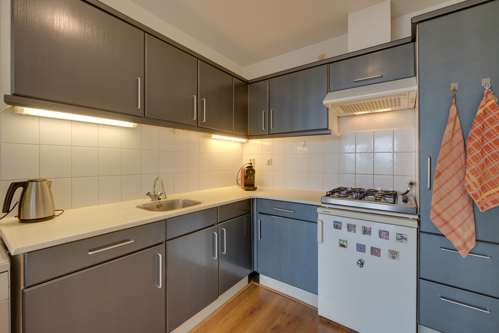 De halfopen keuken is uitgevoerd in een hoekopstelling en voorzien van diverse apparatuur, waaronder een gaskookplaat, vaatwasser, koelkast met vriesvak en afzuigkap. Aansluitend bevindt zich de bijkeuken met extra opbergruimte en de aansluitingen voor wasmachine en droger.