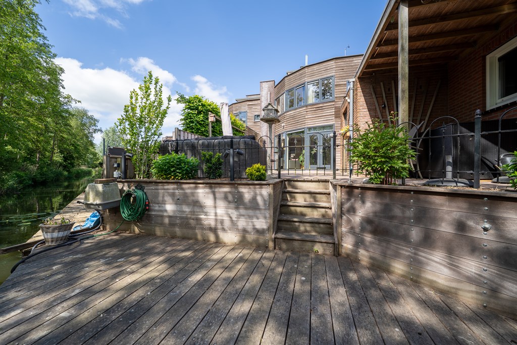 - Back garden (southeast): accessible from both the side garden and living room, offering a well-maintained outdoor space directly on the water. At the rear, you’ll find a covered seating area and a wooden jetty (2022), where you can relax in peace and enjoy the surrounding greenery.