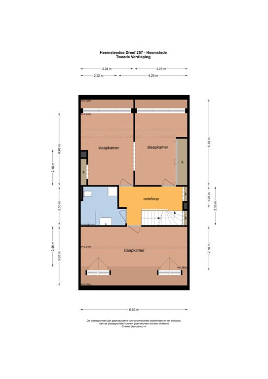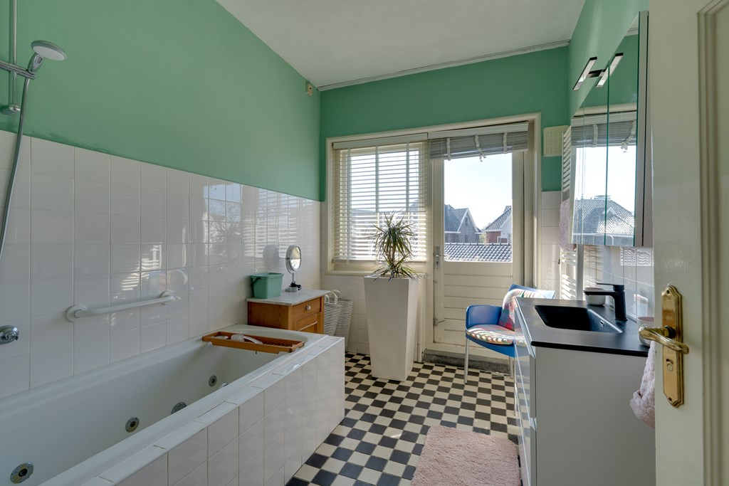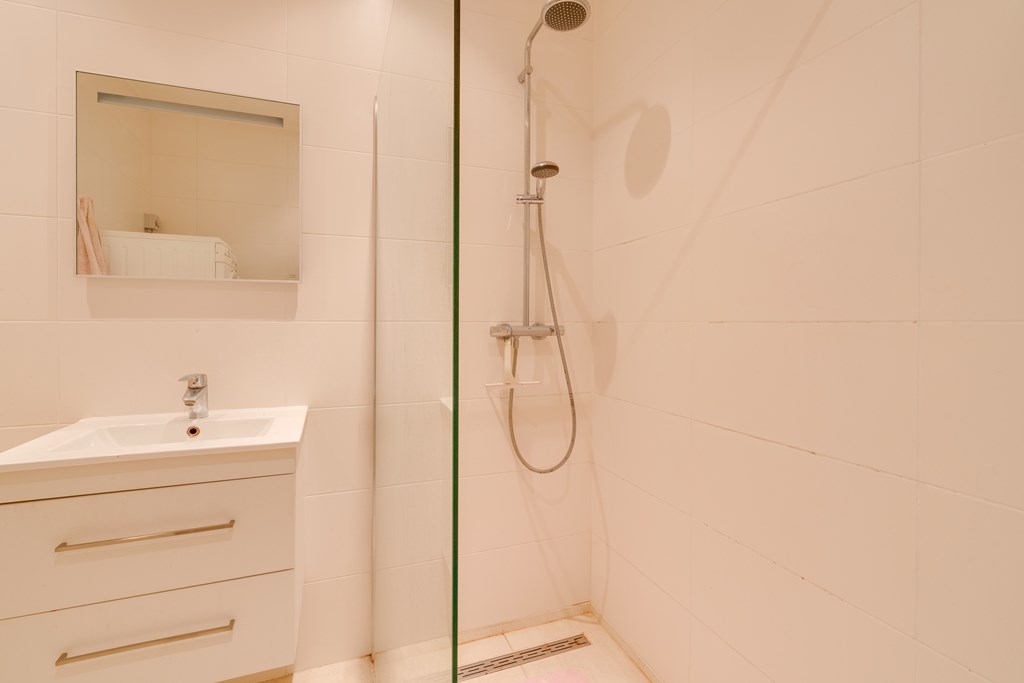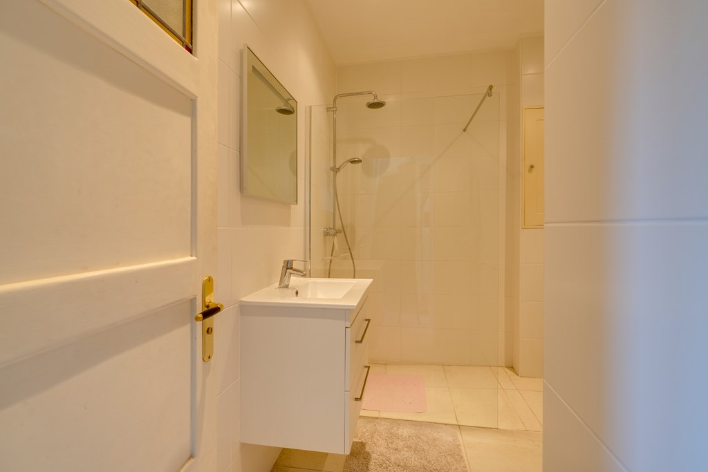 Tweede etage: drie slaapkamers, diverse inbouwkasten, groot dakkapel en een tweede badkamer met inloopdouche, toilet en aansluitingen voor wasapparatuur.