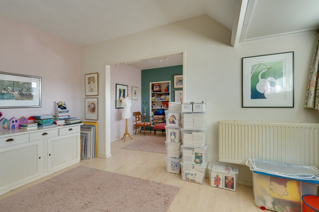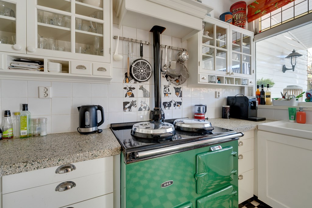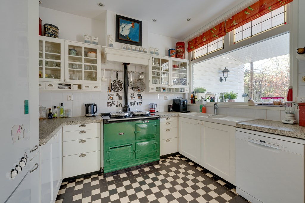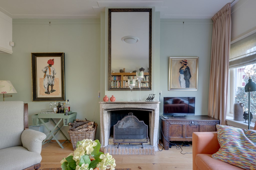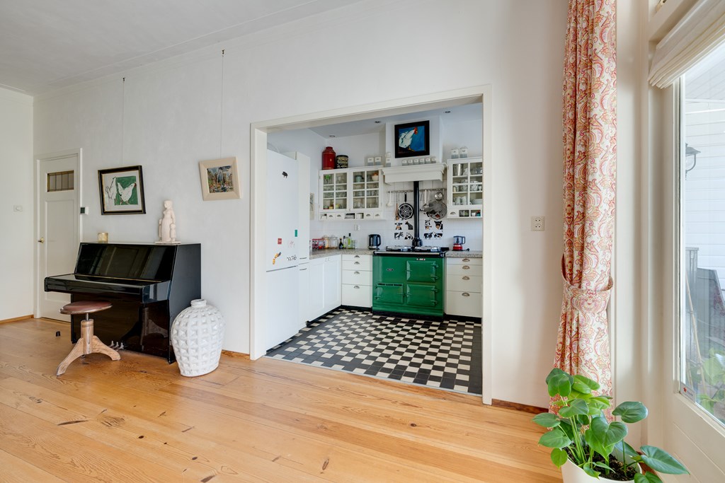 Wat direct opvalt, is de enorme hoeveelheid ruimte. Verdeeld over vier woonlagen vind je zes slaapkamers, een kelder, twee badkamers en in totaal drie toiletten. De woonkamer is licht en sfeervol, met een open haard, hoge plafonds met Amsterdamse plint en een vloer van Amerikaans grenen. Via ensuite deuren bereik je de eetkamer met openslaande deuren naar de tuin. De landelijke keuken is compleet uitgerust met o.a. een AGA gasfornuis met ovens, granieten werkblad, koel-vriescombinatie en vaatwasser.