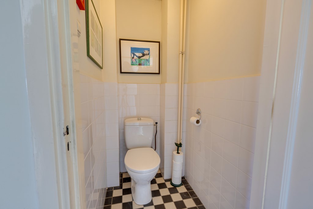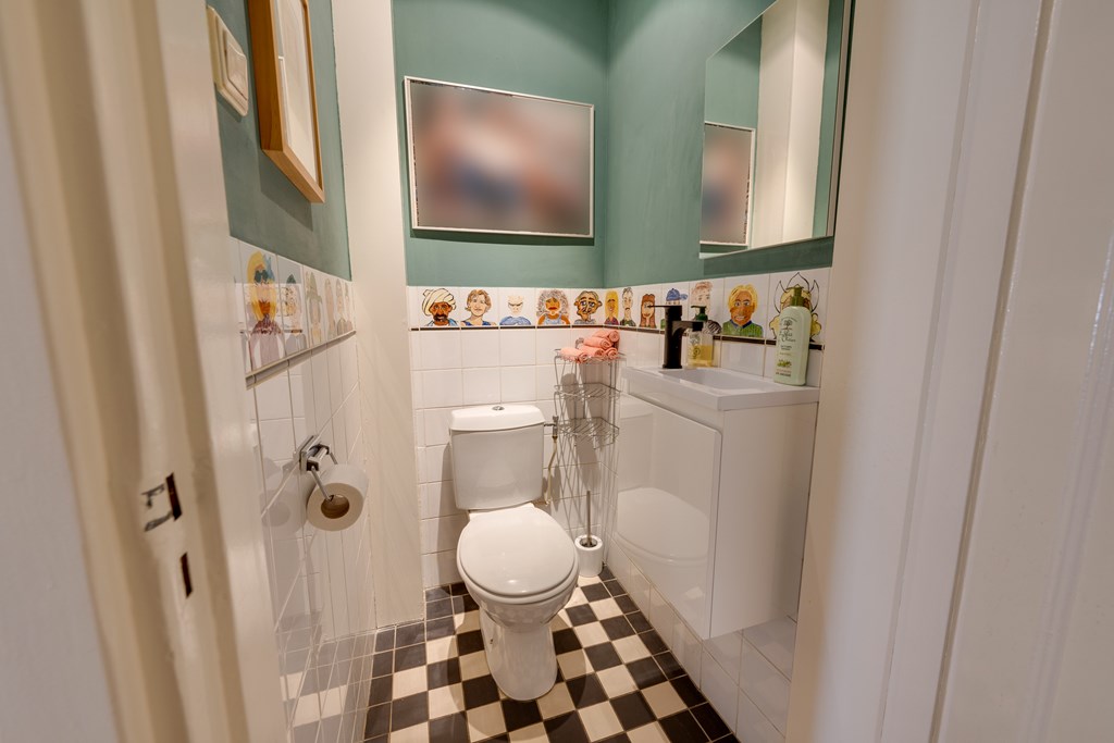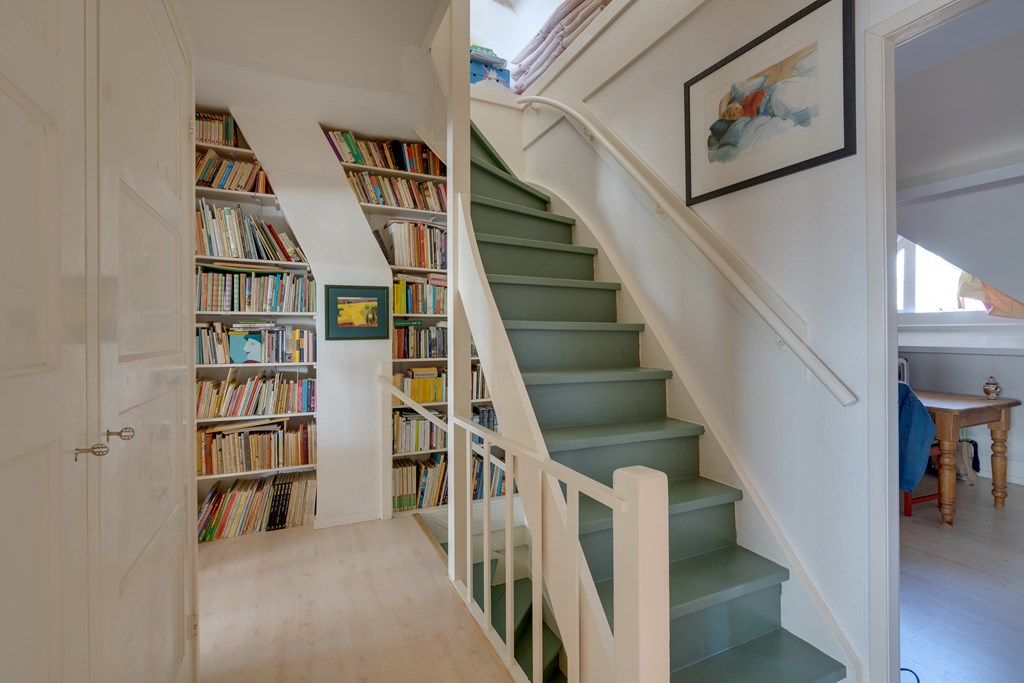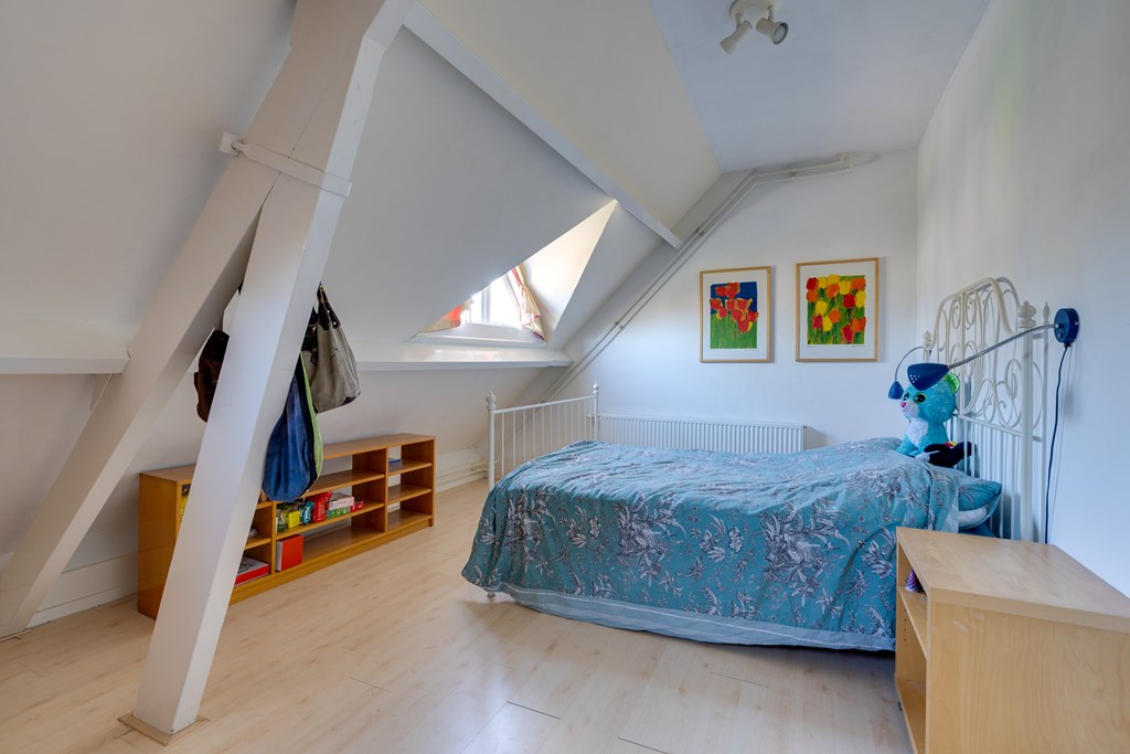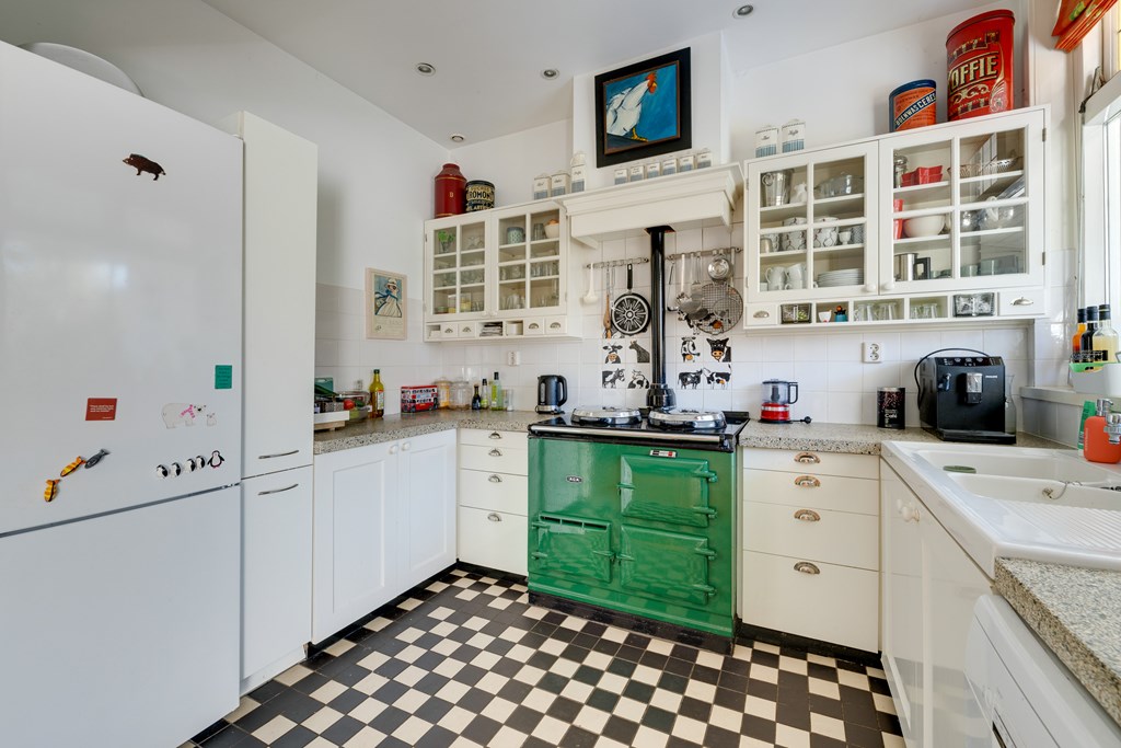 What immediately stands out is the abundance of space. Spread across four floors, you will find six bedrooms, a basement, two bathrooms, and a total of three toilets. The living room is bright and inviting, featuring a fireplace, high ceilings with classic Amsterdam-style moulding, and an American pinewood floor. Through the ensuite doors, you reach the dining room with French doors opening onto the garden. The country-style kitchen is fully equipped with, among other things, an AGA gas cooker with ovens, a granite countertop, fridge-freezer, and dishwasher.