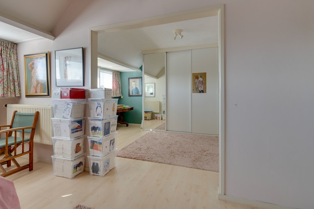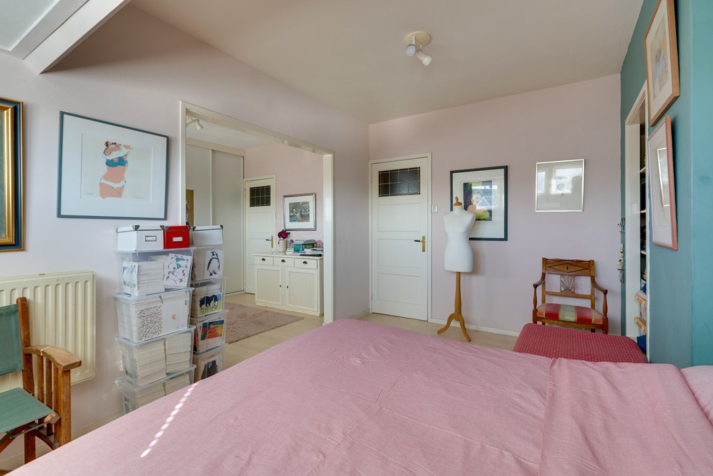 Eerste etage: twee ruime slaapkamers met balkons (oost en west), een derde slaap-/werkkamer en een complete badkamer met Whirlpool bad, toilet en toegang tot het balkon.