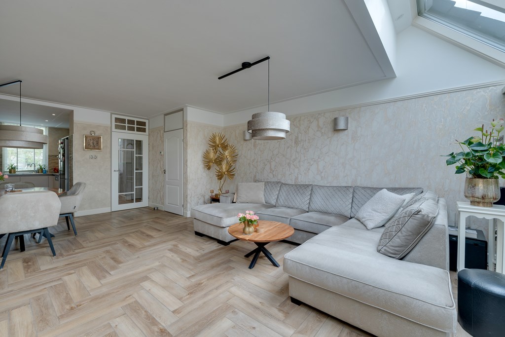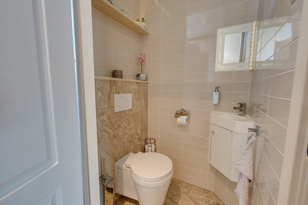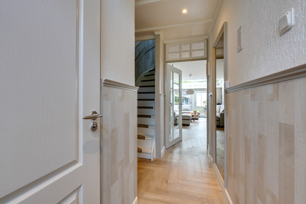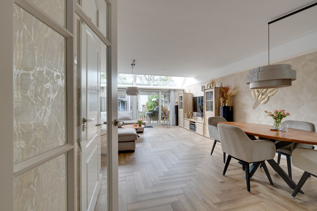 You enter through the hall with a modern toilet and staircase. The bright and spacious living room feels extra airy thanks to the extension and large windows. Through the sliding doors, you reach the beautiful veranda with built-in lighting – an extension of the living room and the perfect place to enjoy outdoor living all year round.