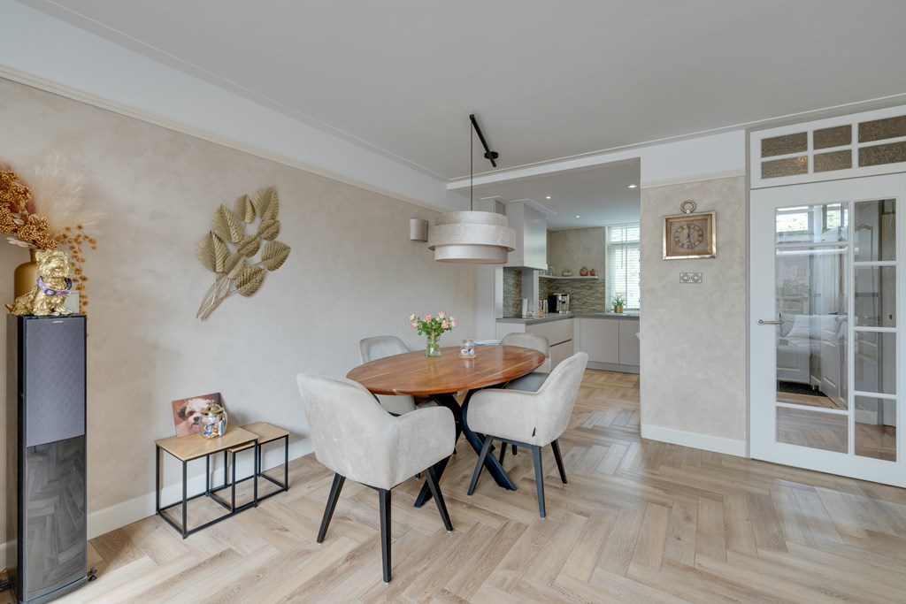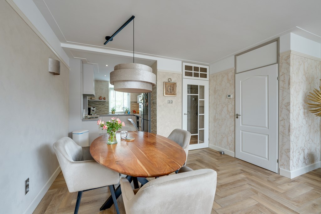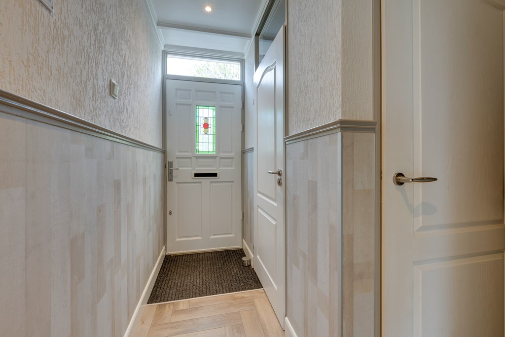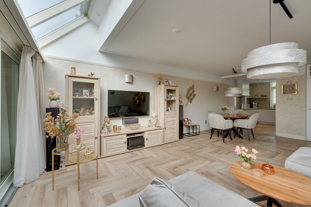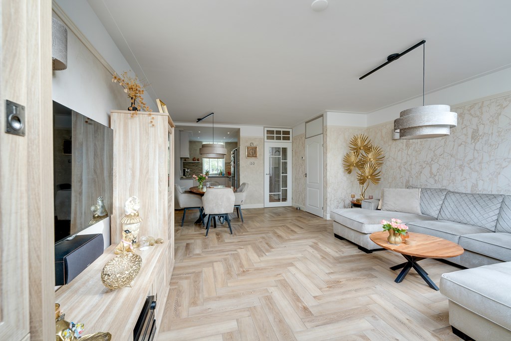You enter through the hall with a modern toilet and staircase. The bright and spacious living room feels extra airy thanks to the extension and large windows. Through the sliding doors, you reach the beautiful veranda with built-in lighting – an extension of the living room and the perfect place to enjoy outdoor living all year round.