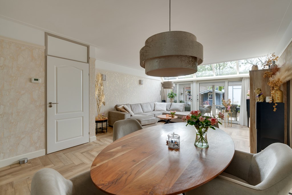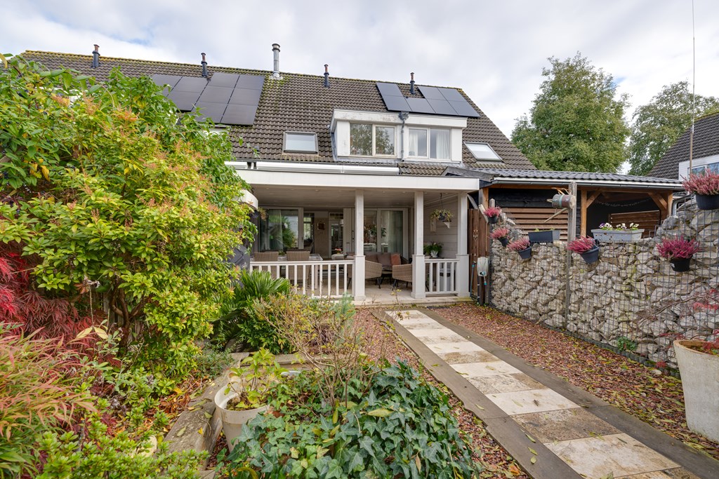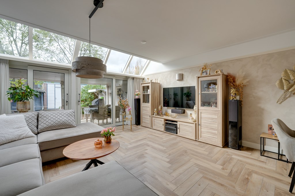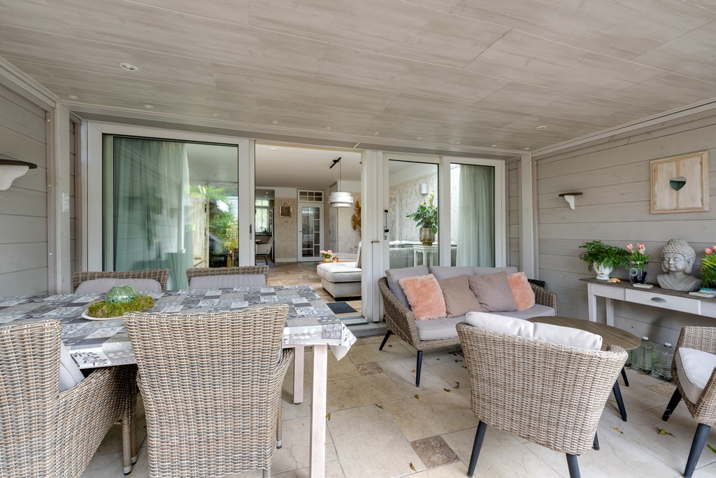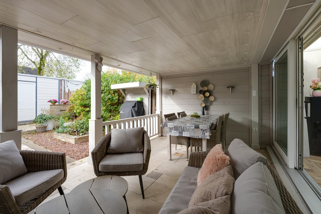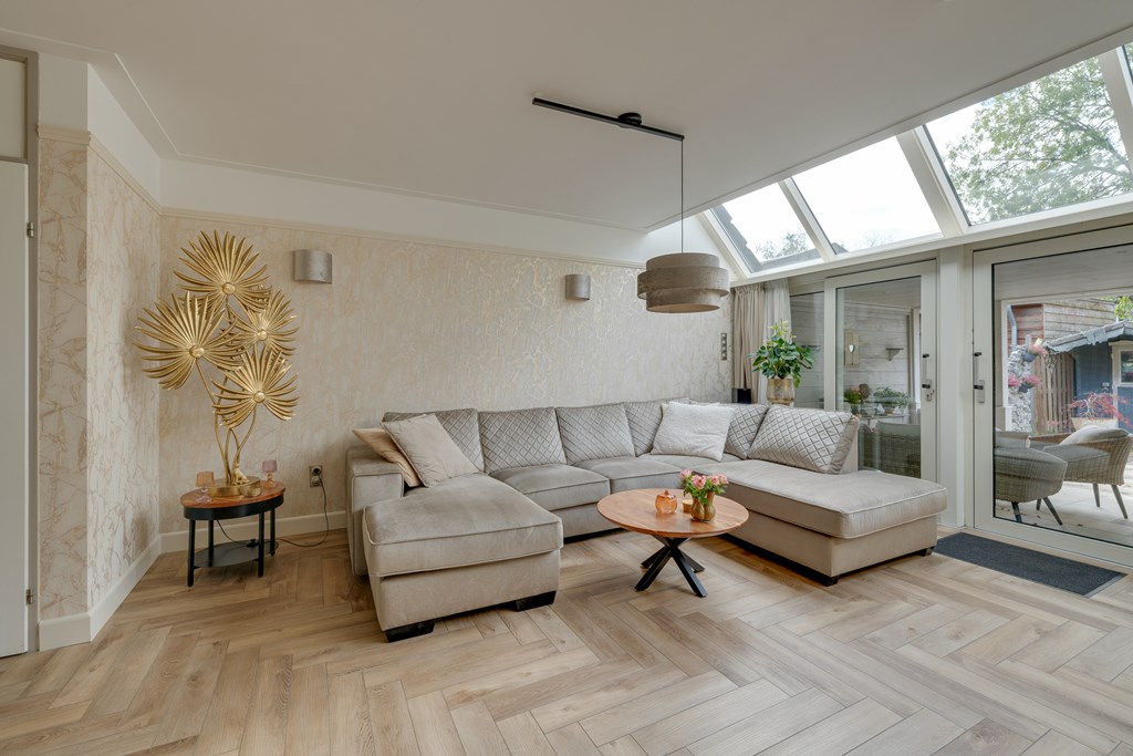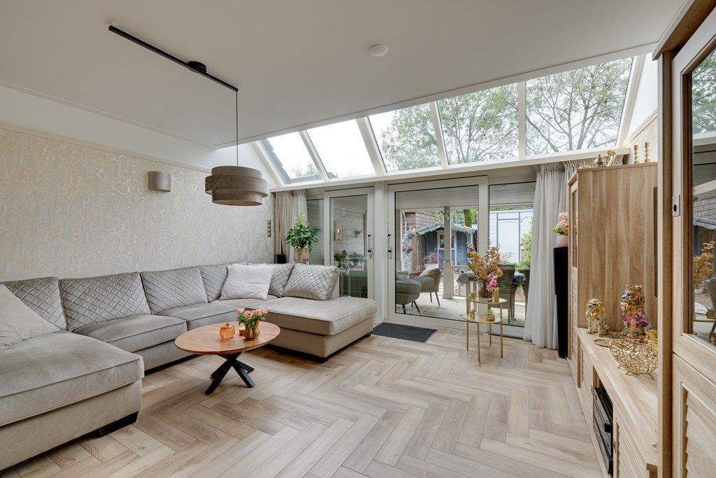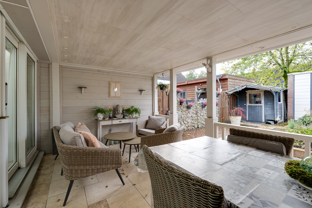 Je komt binnen in de hal met modern toilet en trapopgang. De sfeervolle woonkamer is door de uitbouw en grote ramen heerlijk licht en ruim. Via de schuifpui bereik je de prachtige veranda met inbouwverlichting – een verlengstuk van de woonkamer en de ideale plek om het hele jaar door te genieten van buiten.